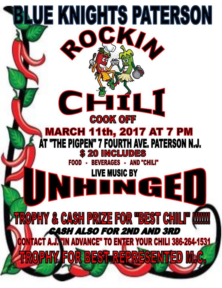 Blue Knights Rock Chili Cook Off March 11th at The PigPen, 7 Fourth Ave., Patterson. $20 includes Food, Beverages and Chili. Live Music by “Unhinged”. Trophy and cash prize for best Chili. Cash also for 2nd and 3rd . Contact AJ in advance to enter your chili 386-264-1531
