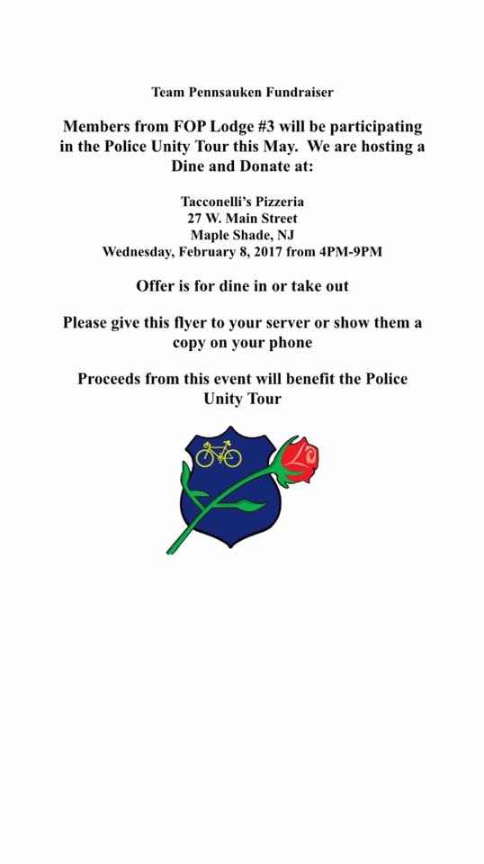 Police Unity Team Pennsauken Fundraiser – Members from FOP Lodge 3 will be participating in the Police Uity Tour this May. We are hosting a Dine and Donate at; Tacconellis Pizzeria, 27 W Main St., Maple Shade, NJ on Wednesday, Feb 8th from 4-9pm. Offer is for dine in or take out.