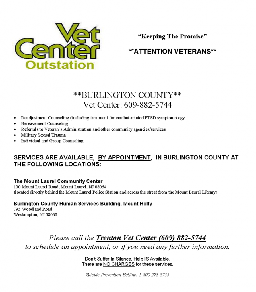 Vet Center counseling services are now available EVERY Monday at the Mt. Laurel Campus, BRIGGS ROAD CENTER, ROOM #107