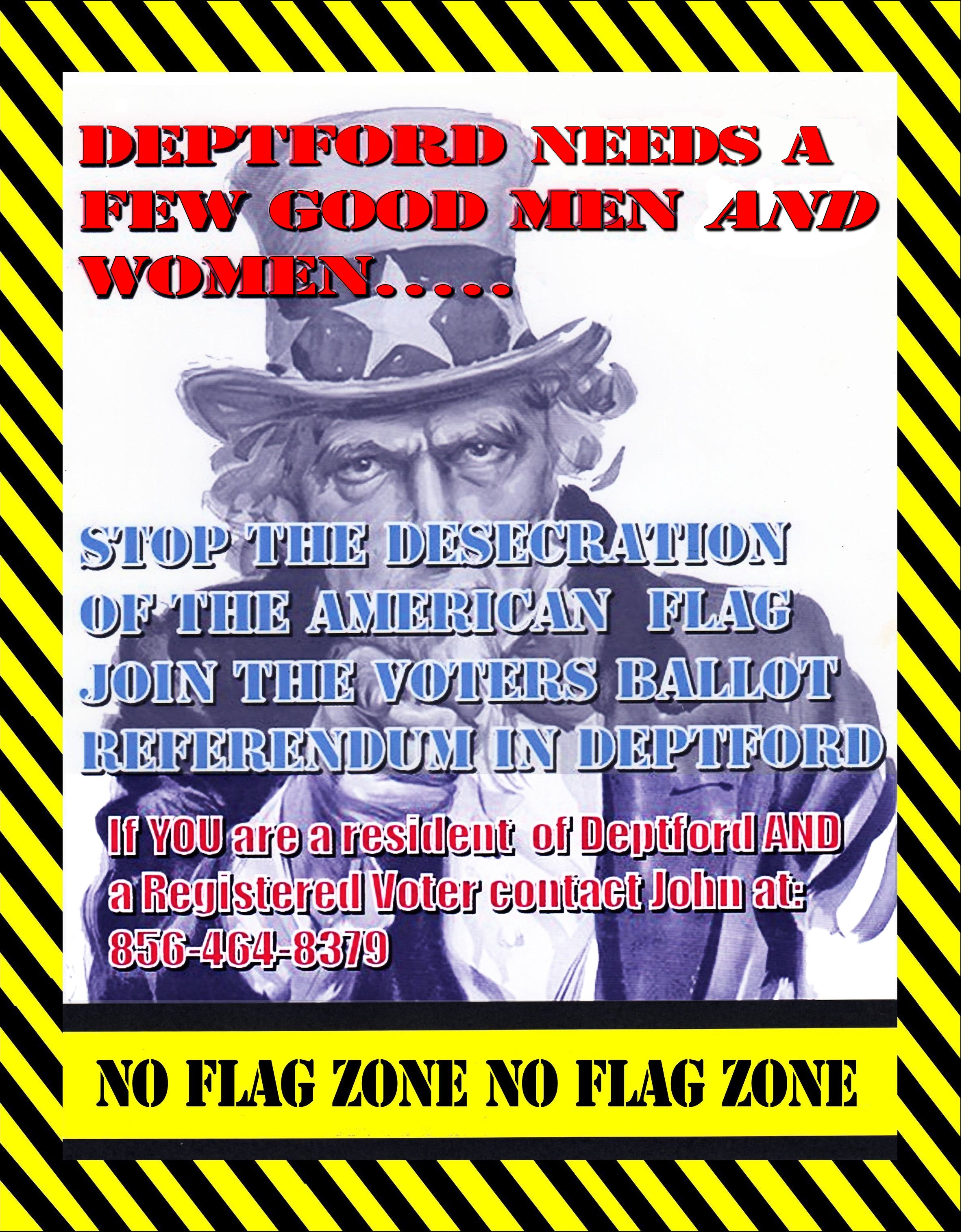 Deptford needs a few good MEN and WOMEN! A Ballot Signature Drive is being organized under the Faulkner Act to stop any further construction and desecration of the American Flag at the Veterans Park in Oak Valley, Deptford Twp by the Council and Mayor Medany. If you are a Veteran AND a registered Voter in Deptford, you can help get the issue of the present flag construction on the November Ballot and stop the violation of Federal Code. You can contact me at 856-464-8379 or come to the Flag protest at the Veterans Park any Saturday between 10:AM and 12:00 for details. Mayor Medany was quoted the following statements: He said he would not budge on the installation. “It’s not going to change”. I think he needs to reconsider his position….More info john_cokos@comcast.net