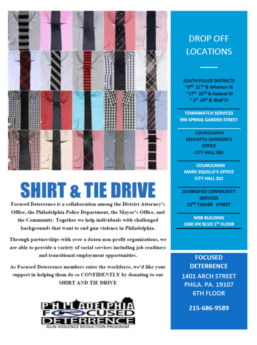 Focused Deterrence is a collaboration among the District Attorney’s Office, the Philadelphia Police Department, the Mayor’s Office, and the Community. Together we help individuals with challenged backgrounds that want to end gun violence in Philadelphia. Through partnerships with over a dozen non-profit organizations, we are able to provide a variety of social services including job readiness and transitional employment opportunities. As Focused Deterrence members enter the workforce, we’d like your support in helping them do so CONFIDENTLY by donating to our SHIRT AND TIE DRIVE.