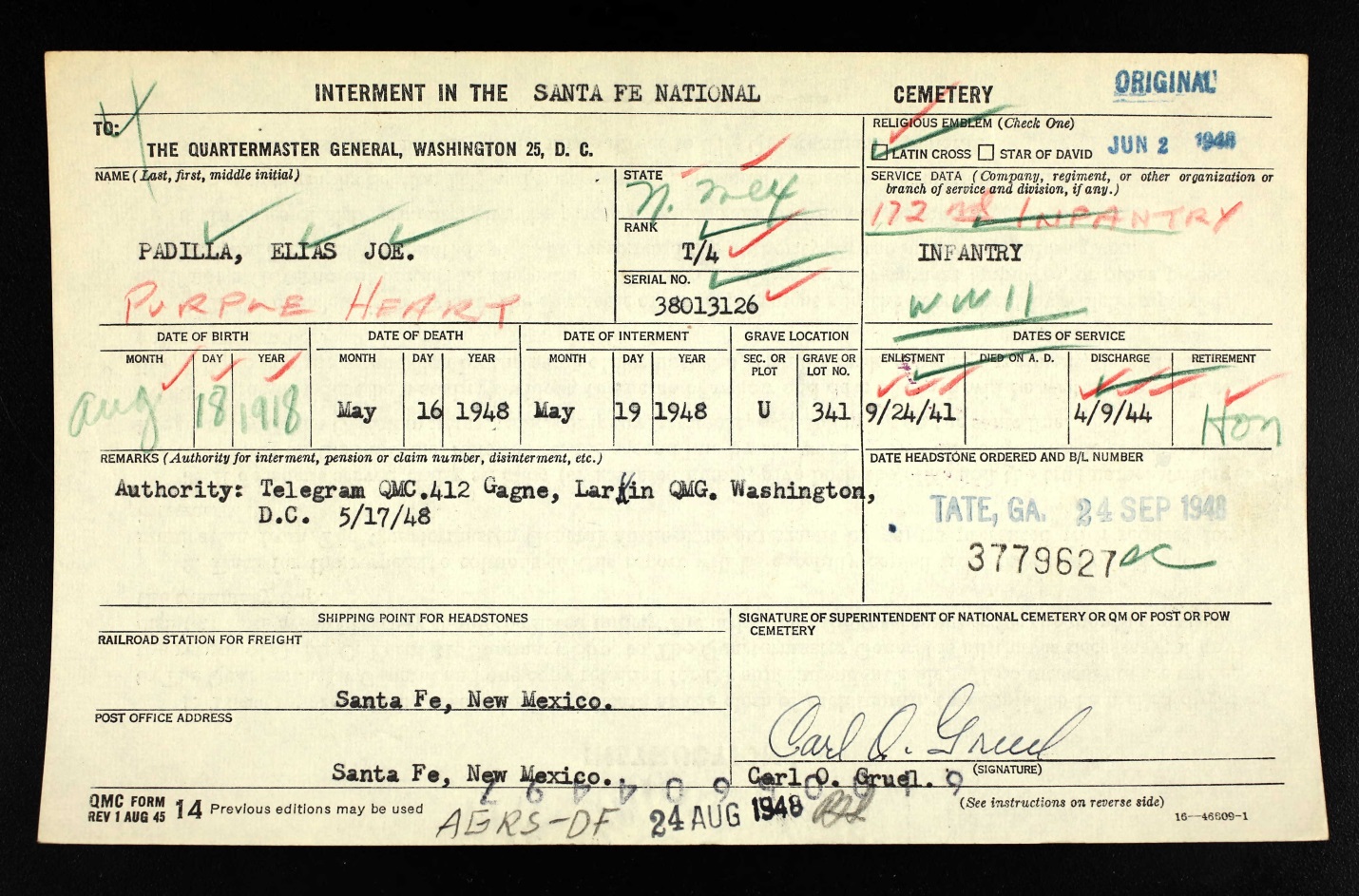 One of those dog tags belong to Elias J. Padilla. Elias was born August 18, 1918 in New Mexico and he served in the Army during WWII. Unfortunately, Elias passed away in 1948.