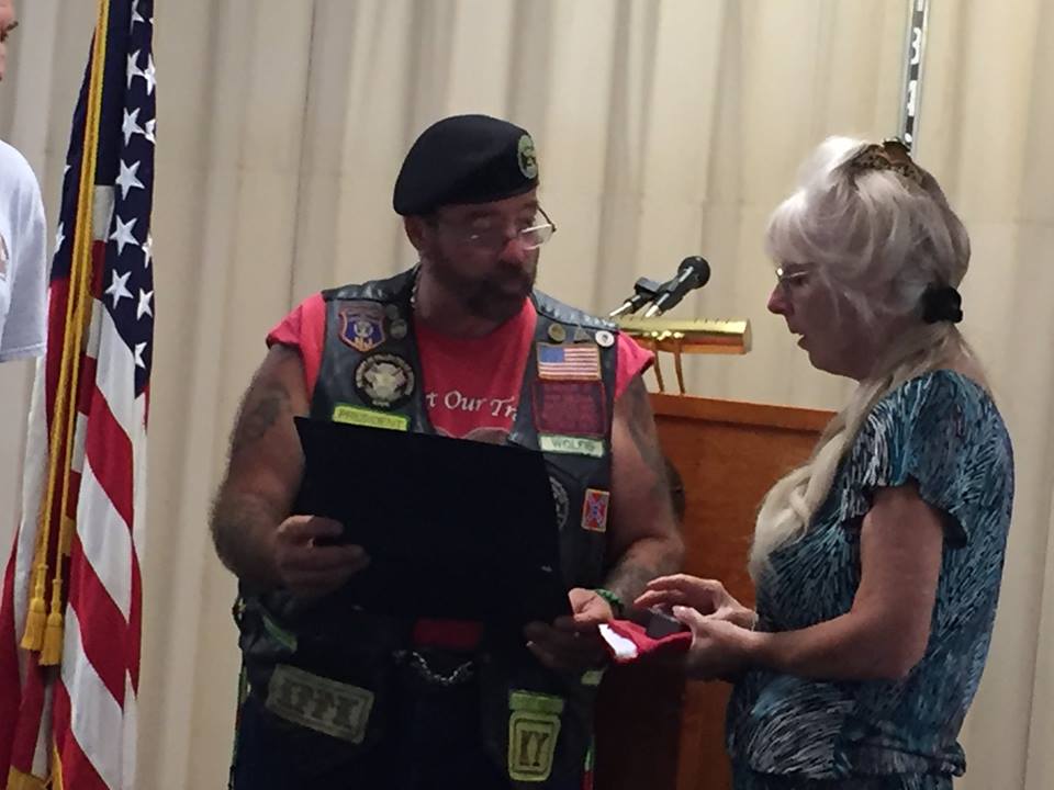 Bob “Wolfie” Henderson, the President of the Nam Knights of America MC Kentucky Chapter, along with the American Legion Riders Post 157, will be presenting Spalding’s widow with her husband’s dog tag in a ceremony at 12noon at the American Legion, 830 Old Preston Hwy S., Shepherdsville, KY