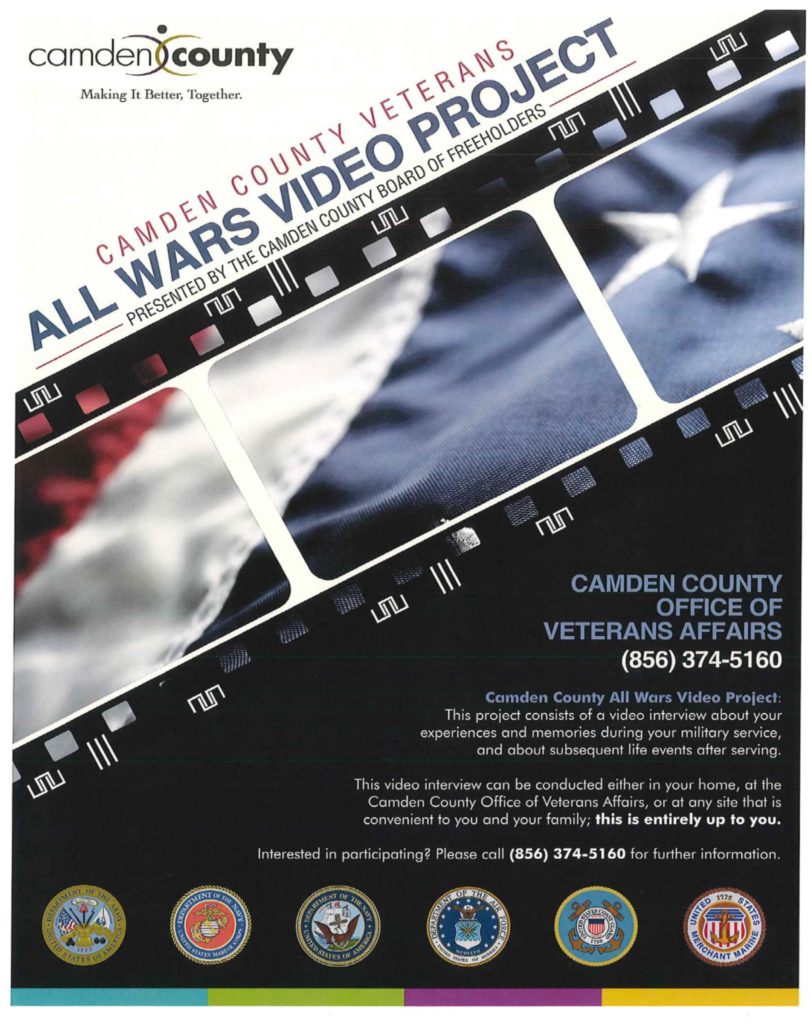 Camden County Office of Veterans Affairs All Wars Video Project – Project consists of a video interview about your experiences and memories during your military service, and about subsequent life events after serving. This interview can be conducted either in your home, at the Camden County Office of Veterans Affairs, or at any site that is convenient. If interested in learning more, please call Adam at 856-374-5160