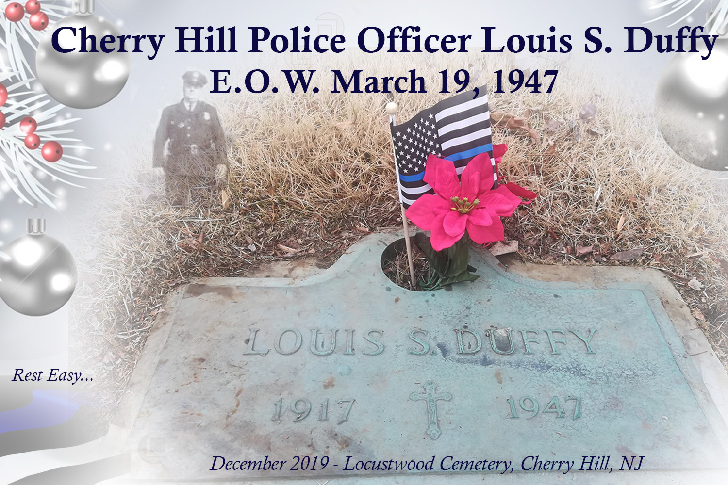Louis Stickney Duffy was born on September 4, 1917, in Baltimore, Maryland. He was a police officer for Cherry Hill Police Department, which at the time was known as Delaware Township.