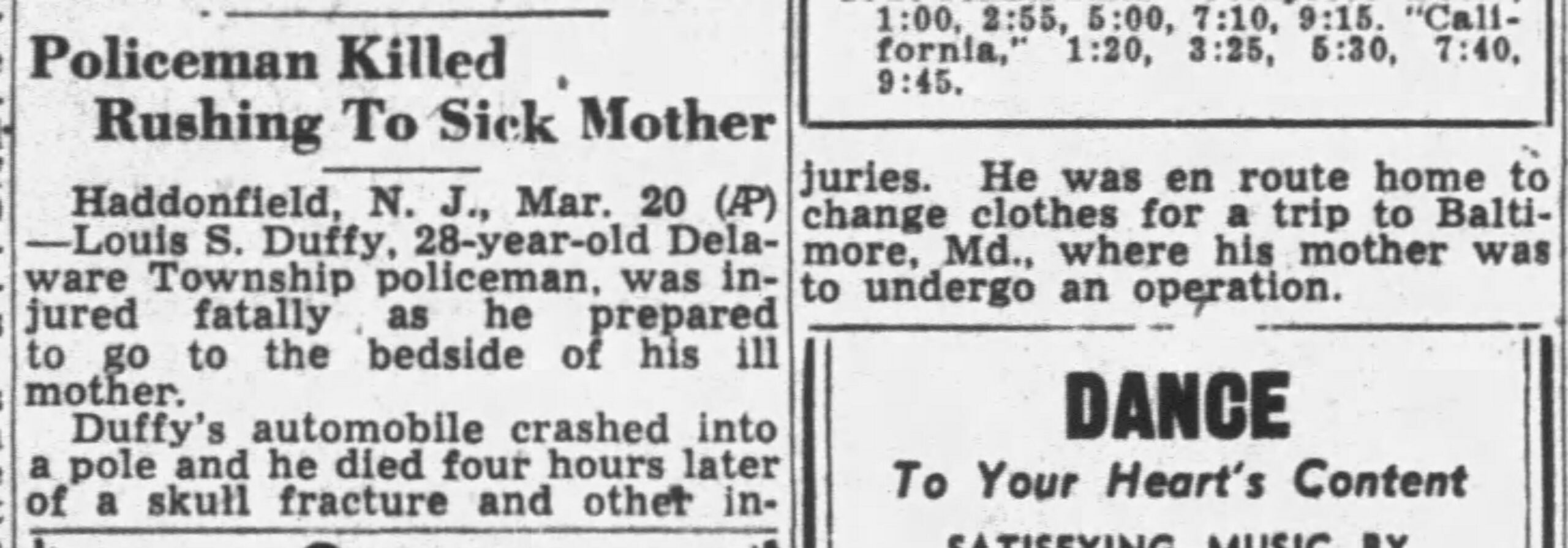 On his way to the tavern, Duffy lost control of his vehicle, hit a pole along Route 70 next to Locustwood Cemetery and severly fractured his skull. A few hours later, the 29 year old patrolman died at the hospital, leaving behind a wife and four children, one as young as 2 years old.