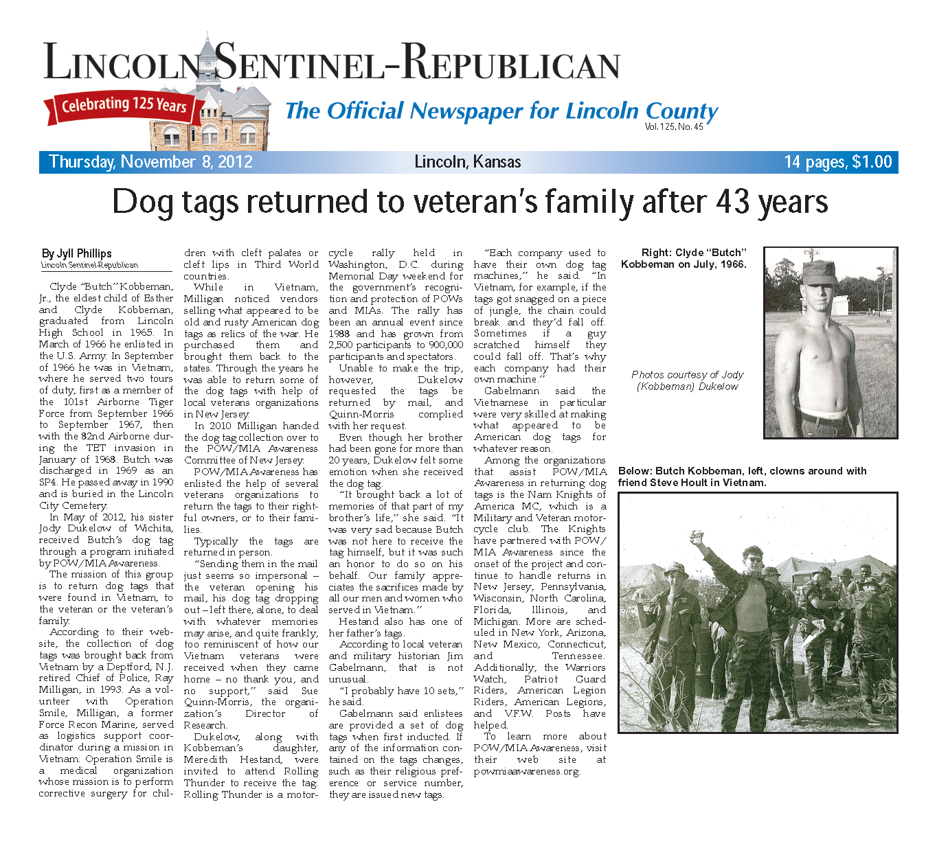 Dukelow along with Kobbemans daughter, Meredith Hestand, were invited to attend Rolling Thunder in Washington, DC, to receive the dog tag. Unable to make the trip, however, Dukelow requested the tags be returned by mail.