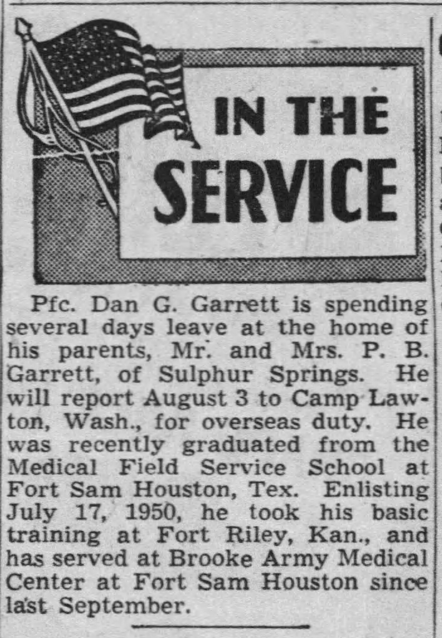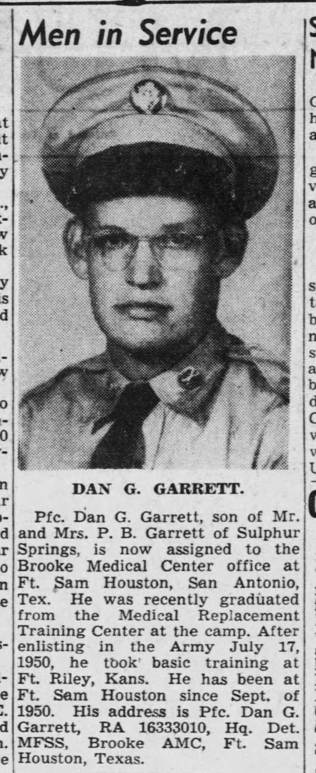 Pfc Garrett enlisted in the Army July 17, 1950 and had basic training at Ft Riley, Kansas. He graduated from the Medical Replacement Training Center at the Brooke Medical Center at Ft Sam Houston in San Antonio, TX in June of 1951.