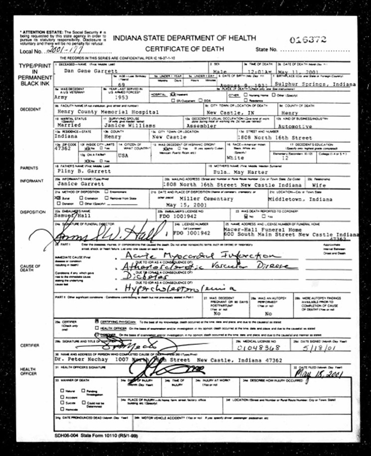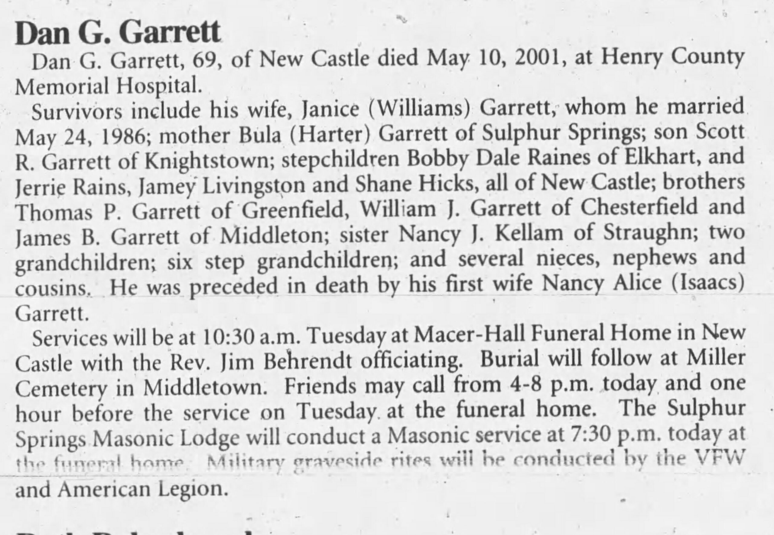 Dan G Garrett, was born August 9, 1931 in Sulphur Springs, Indiana. He was the son of Pliny and Bula Garrett.