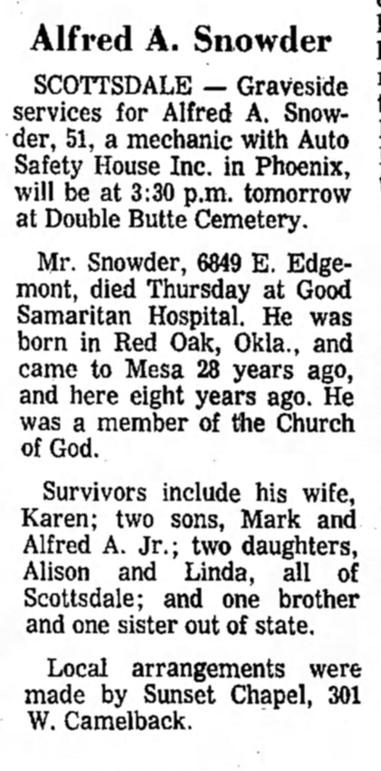 Her husband died at the early age of 51, in 1970. He is buried in Tempe Double Butte Cemetery.