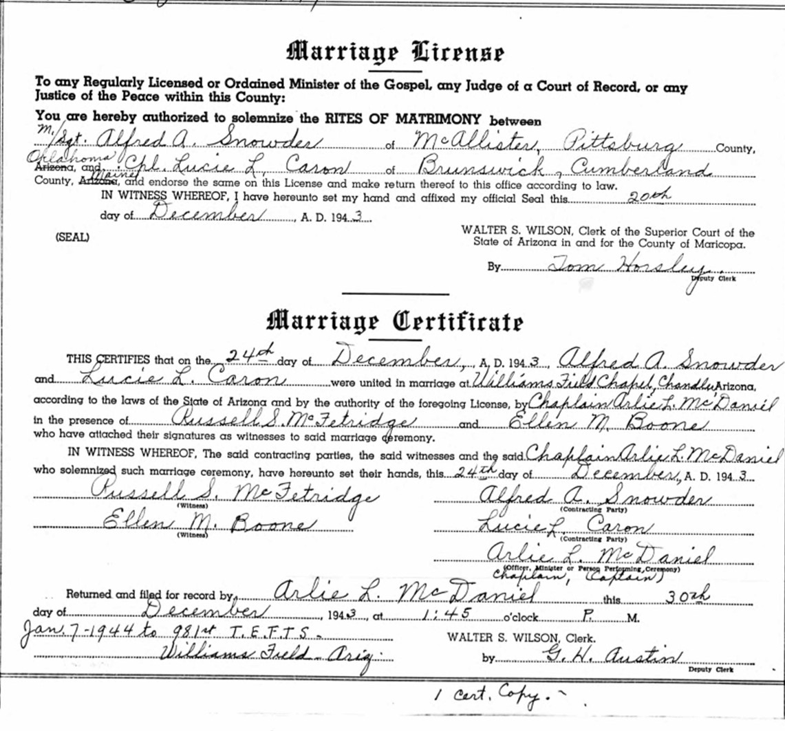 Lucie joined the Woman's Army Corps and attained rank of Sergeant before leaving in 1945. She was part of the WAC detachment at William Field in Arizona.