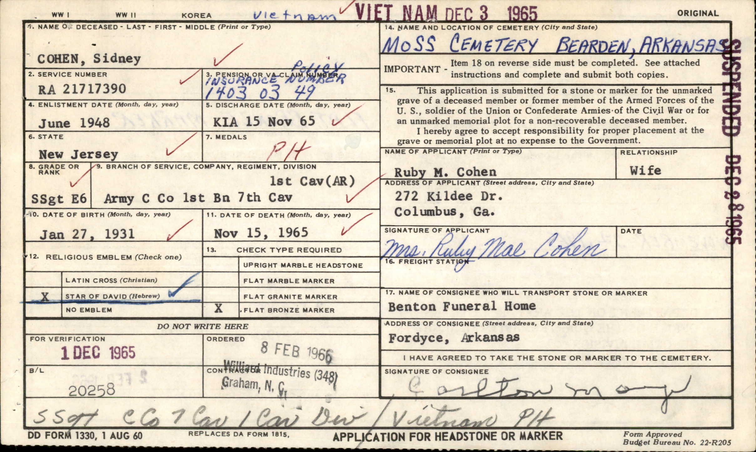 Sidney Cohen enlisted in the US Army in 1949 from his hometown of Camden, NJ. He attained the rank of Staff Sergeant. As a career soldier, he served around the world, including stints in the United Kingdom and Hawaii, before going to Vietnam. His MOS was 11B40, infantry non-commissioned officer. Army records available from the National Archives indicate that he had been awarded the Bronze Star prior to his service in Vietnam, most likely in Korea.