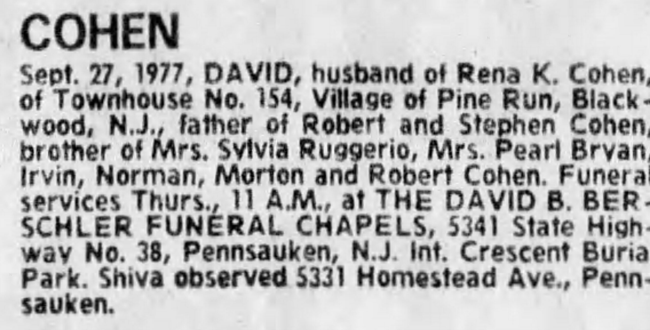 Robert Cohen - Passed away Oct. 12, 2012. Husband of Elaine Cohen. Father of Scott J. Cohen. Grandfather of Alexis, Olivia and Phoebe. Brother of Pearl Bryan and the late Irvin, David, Norman, Morton (Porky), Sylvia and Sidney.