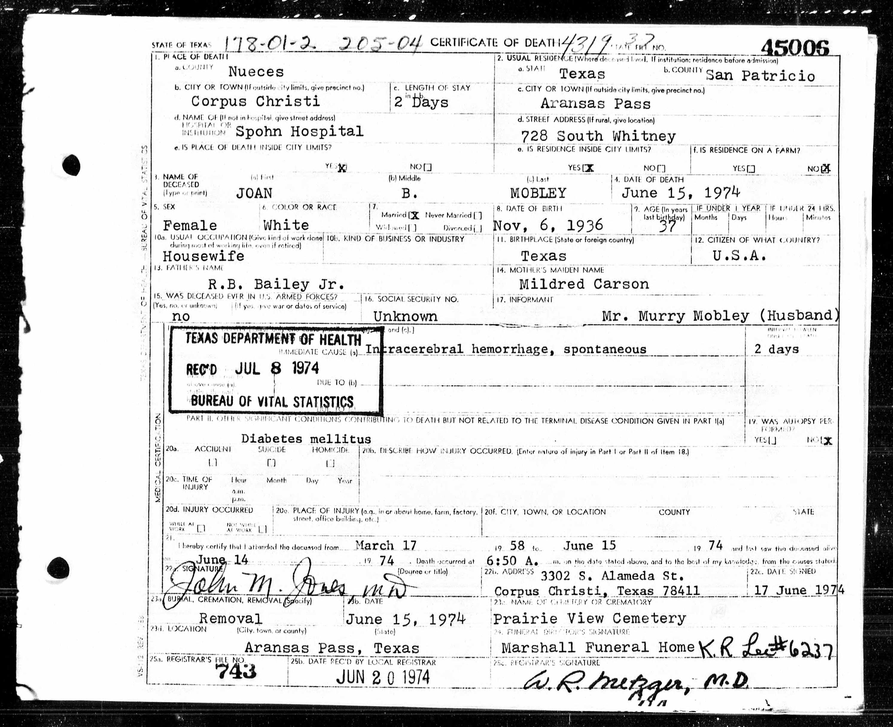 He married Joan Bailey Mobley on August 24, 1962, in Harris, Texas. Joan died at the age 37 and is buried at Prairie View Cemetery, Aransas Pass, TX . They had been married 11 years.