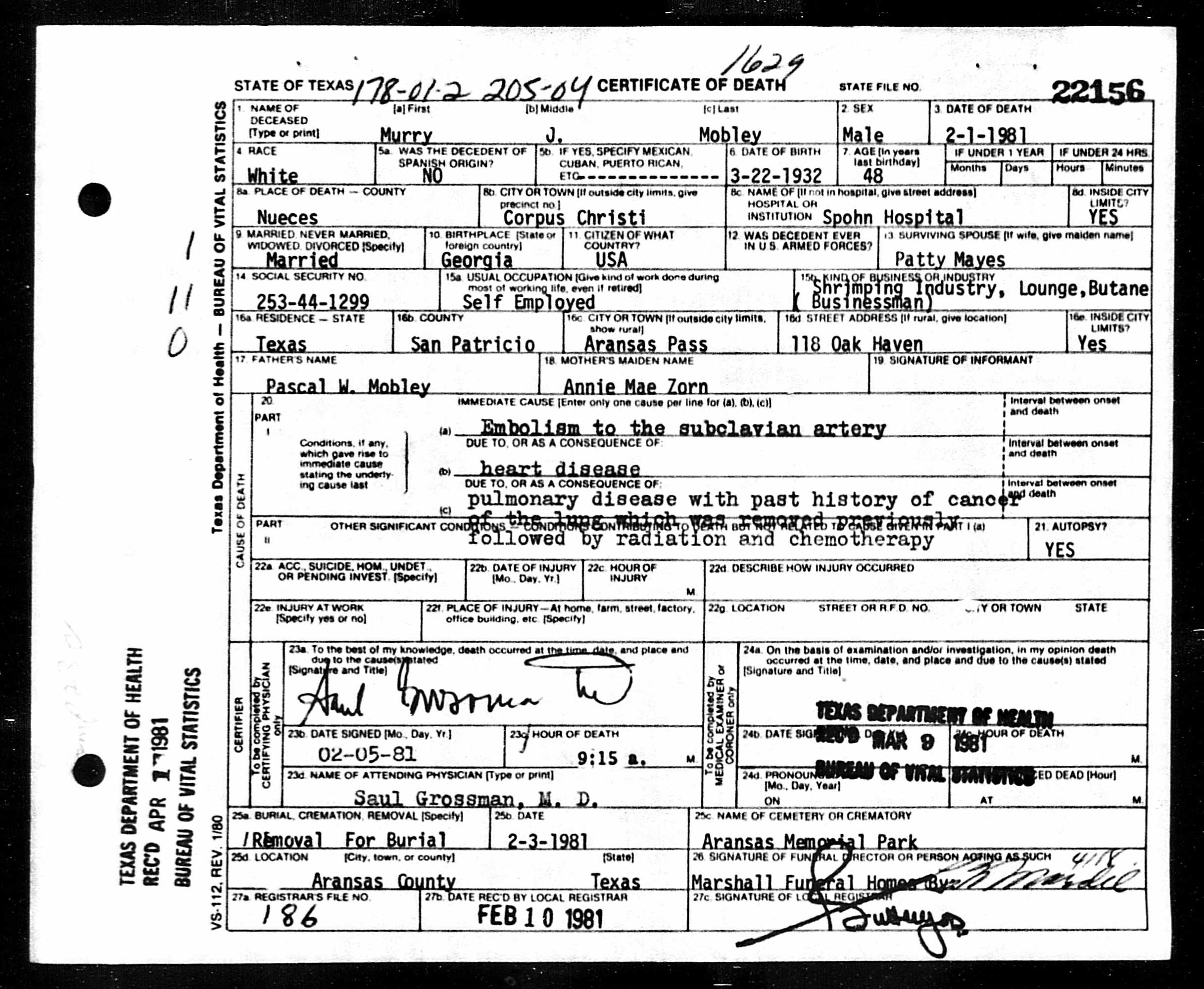 On February 1, 1981, in Nueces, Texas, Murry Mobley died at the age of 48, and he is buried in Aransas Memorial Park Cemetery, Rockport, Texas.
