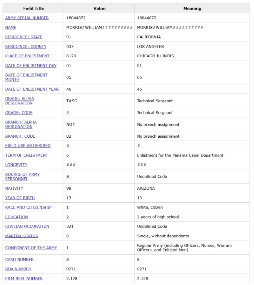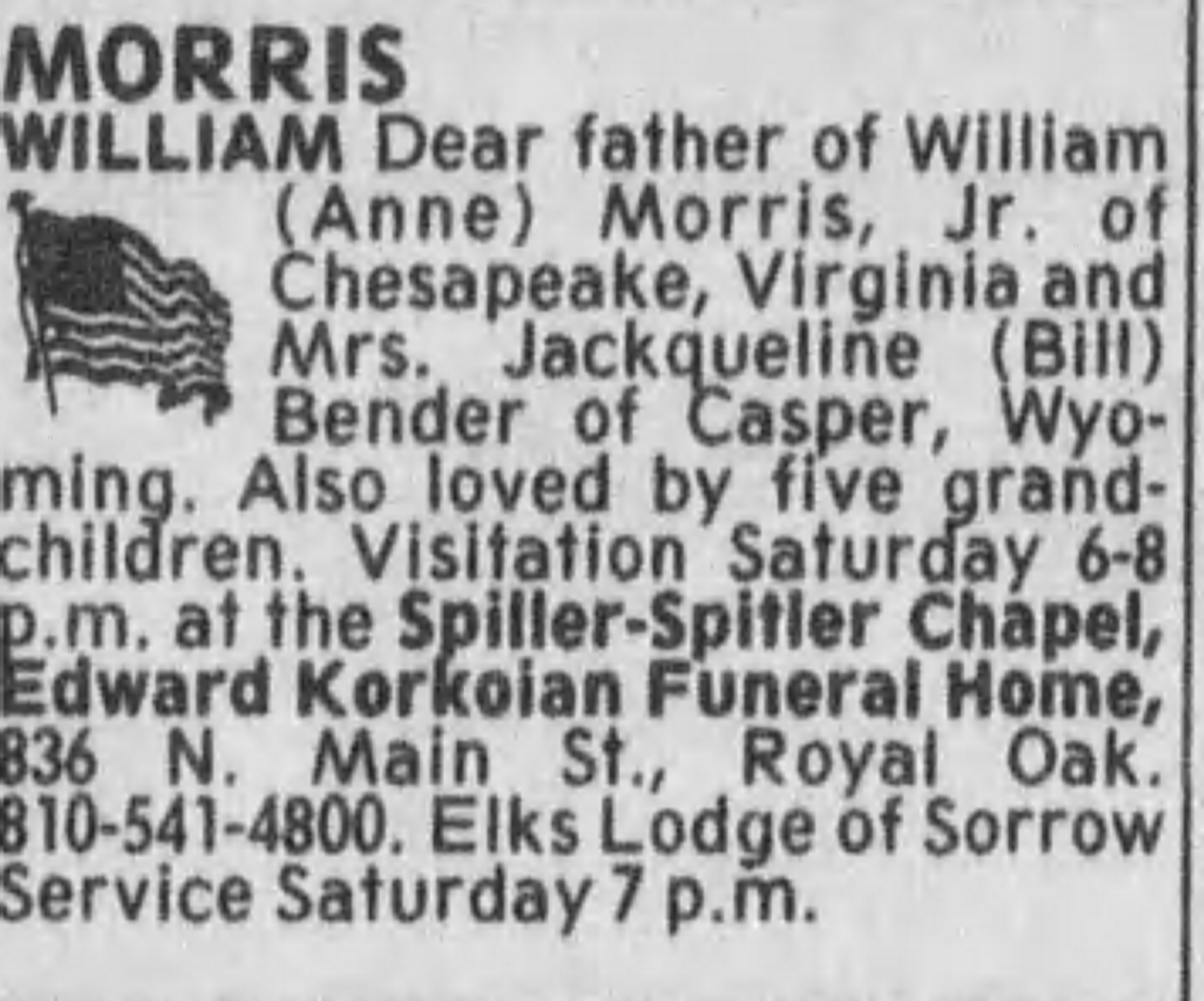 This WWII hero, William Morris, was born September 23, 1913 in Miami, Gila, Arizona and passed away on October 12, 1994 in Madison Heights, Michigan. Thank you for your service - you are not forgotten.