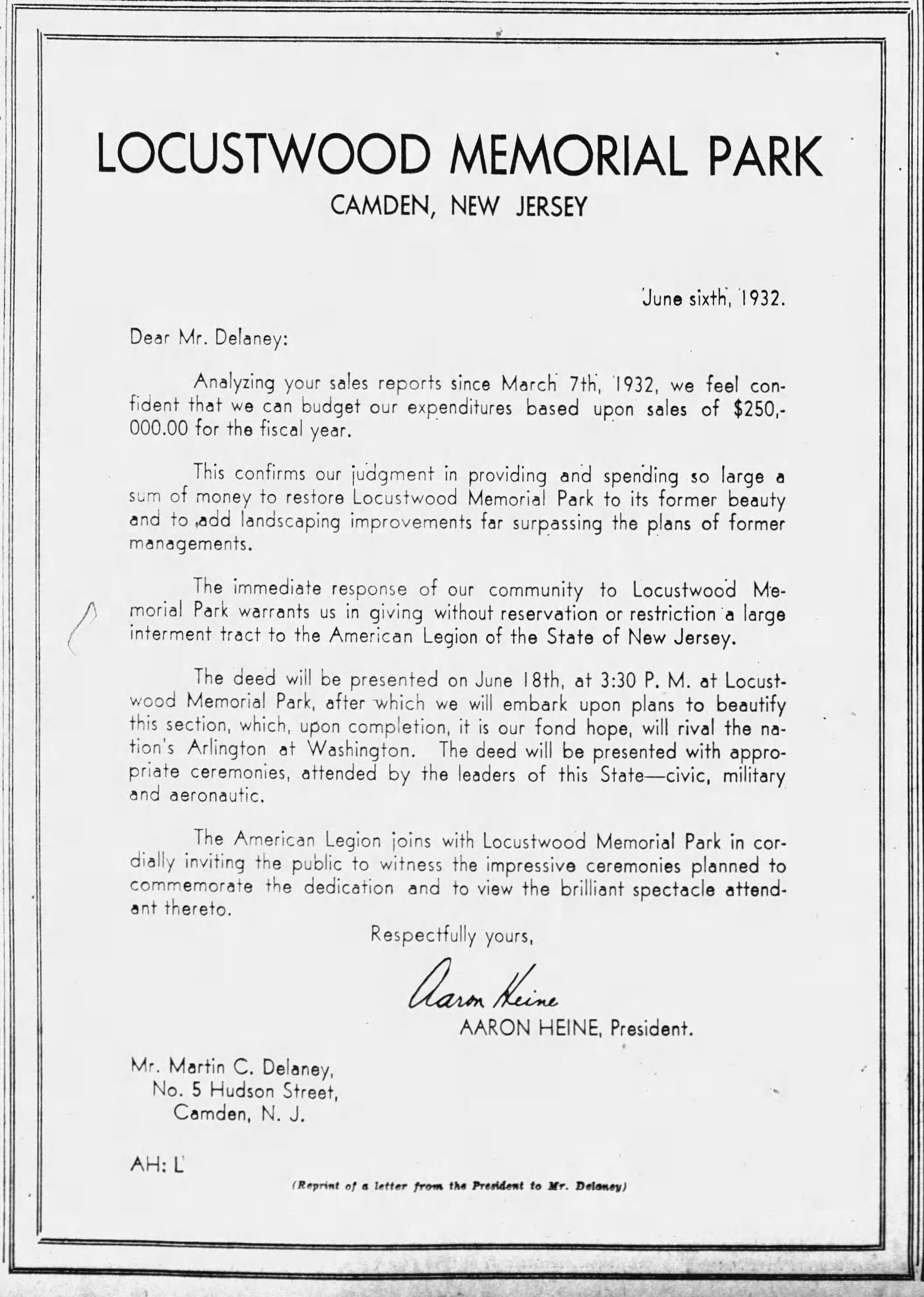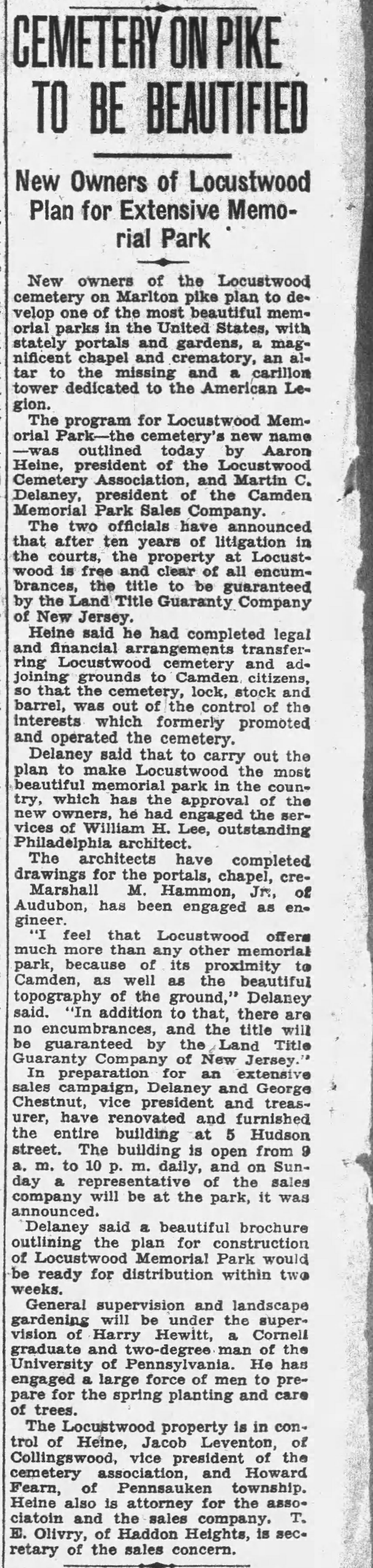 History Preserved in Locustwood Doric Columns As you enter historic Locustwood Memorial Park in Cherry Hill, you pass by one of the most iconic landmarks in the Southern New Jersey area. Four stately Doric columns soar twenty-five feet high at the corner entrance, surrounded by lush evergreens and seasonal flowers. A prominent blue-toned pool fountain placed as you come into the main boulevard entrance of the cemetery also enhances your welcome. The origins of the columns have been a mystery for some time, with only rumors of who had placed them there and from where they might have come. The story begins when the previous owner of Locustwood, Aaron Heine, was visiting a relative in New York. At that time, the 1939 World’s Fair grounds were being demolished. Pieces of buildings and equipment were being sold off and Mr. Heine saw the tan-hued granite columns and fell in love with them. He liked them so much that he bought them and had them shipped to the cemetery with only an idea of how he would use them. He hired a prominent local master stonemason to build the pedestal base foundation and the fountain that precedes it. The columns were carefully erected and remain steadfast to this day. The mason also was noted for doing the memorable stonework on the famous Rickshaw Inn, across from the legendary Garden State Racetrack. The popular Latin Casino was also located only a short distance away. At that time, this part of Cherry Hill was the Atlantic City of its day. But as time went by, people came and left Locustwood Memorial Park and only a few knew the truth that had been forgotten. Stonemor Partners took over operation of Locustwood in the mid 1990’s. When, in 2011, new associates came into the Sales & Administration departments and the origins of the columns were questioned, the Internet was abuzz with their inquiries. After months of searching through photos and records online and in the basement of the office, a photo was finally found. There, in the elusive photo, were the four unique columns supporting the Ohio Building in the Court of States Government Zone at the 1939 New York World’s Fair. The Ohio building housed the elaborate display “The Birthplace of Presidents”, and was a popular educational exhibit at the Fair. The 1939-1940 New York World’s Fair covered 1,216 acres of Flushing Meadows Corona Park in New York City and was the second largest American World’s Fair of all time. A total of 44 million people toured it in its two seasons. This fair was the first to be based on the future and its prospects, and it used the opening slogan and theme “Dawn of a New Day.” Aaron Heine saw the same prospect of changing the look of his beautiful 1903 cemetery and incorporating it into the stylish fashion of the entertaining mecca that was the surrounding Cherry Hill area. To this day, people with heavy hearts enter under the shadows of the stolid columns into the grounds of this “Cemetery Beautiful.” Our mission is to help them in seeing the same “Dawn of a New Day.”