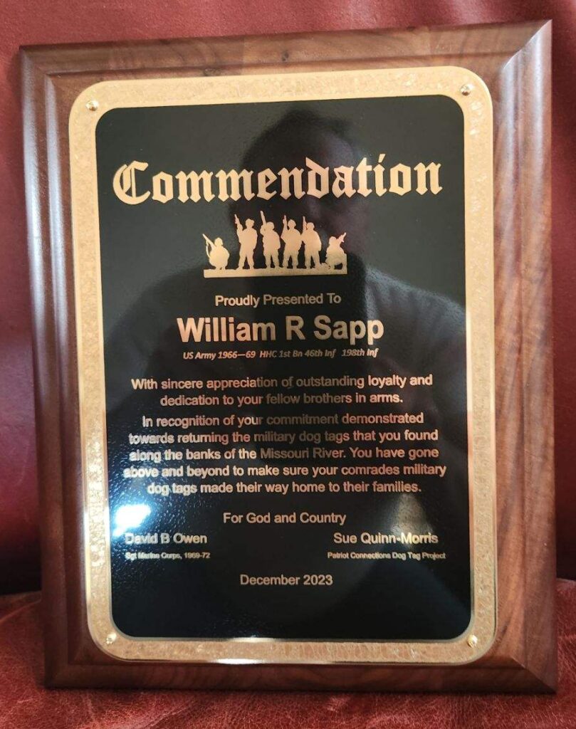 In December of 2023, in a heartwarming presentation, David Owen presented Bill Sapp a Commendation Plaque on behalf of himself and Sue Quinn-Morris of Patriot Connections Dog Tag Project. Bill Sapp's efforts in ensuring the safe return of his comrades' military dog tags truly highlights his commitment to honoring their memory.