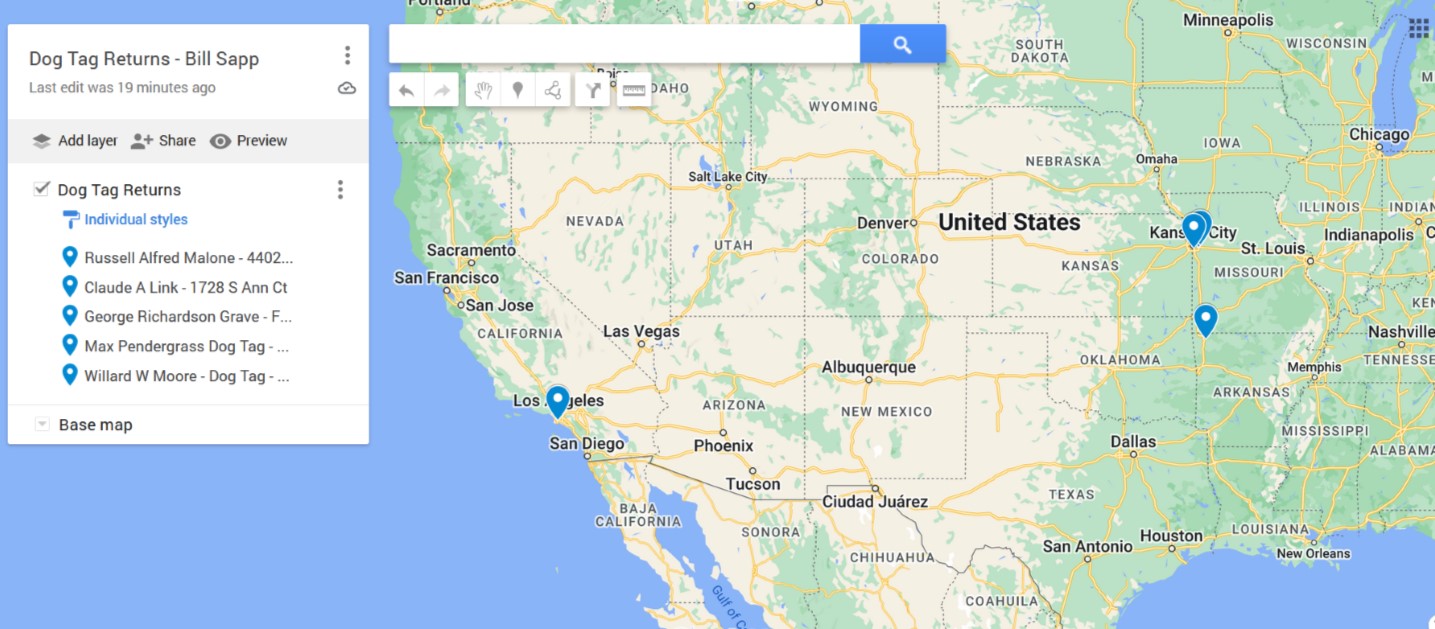 As the veterans and their families were located, the next step fell to Owen who would follow through with returning the dog tags – sometimes in a face to face meeting or a package sent through the mail, each return brought closure and honor to those who had served our country. The dog tags plight covered numerous states – from Missouri, to Arkansas, Texas, California, Iowa and more.