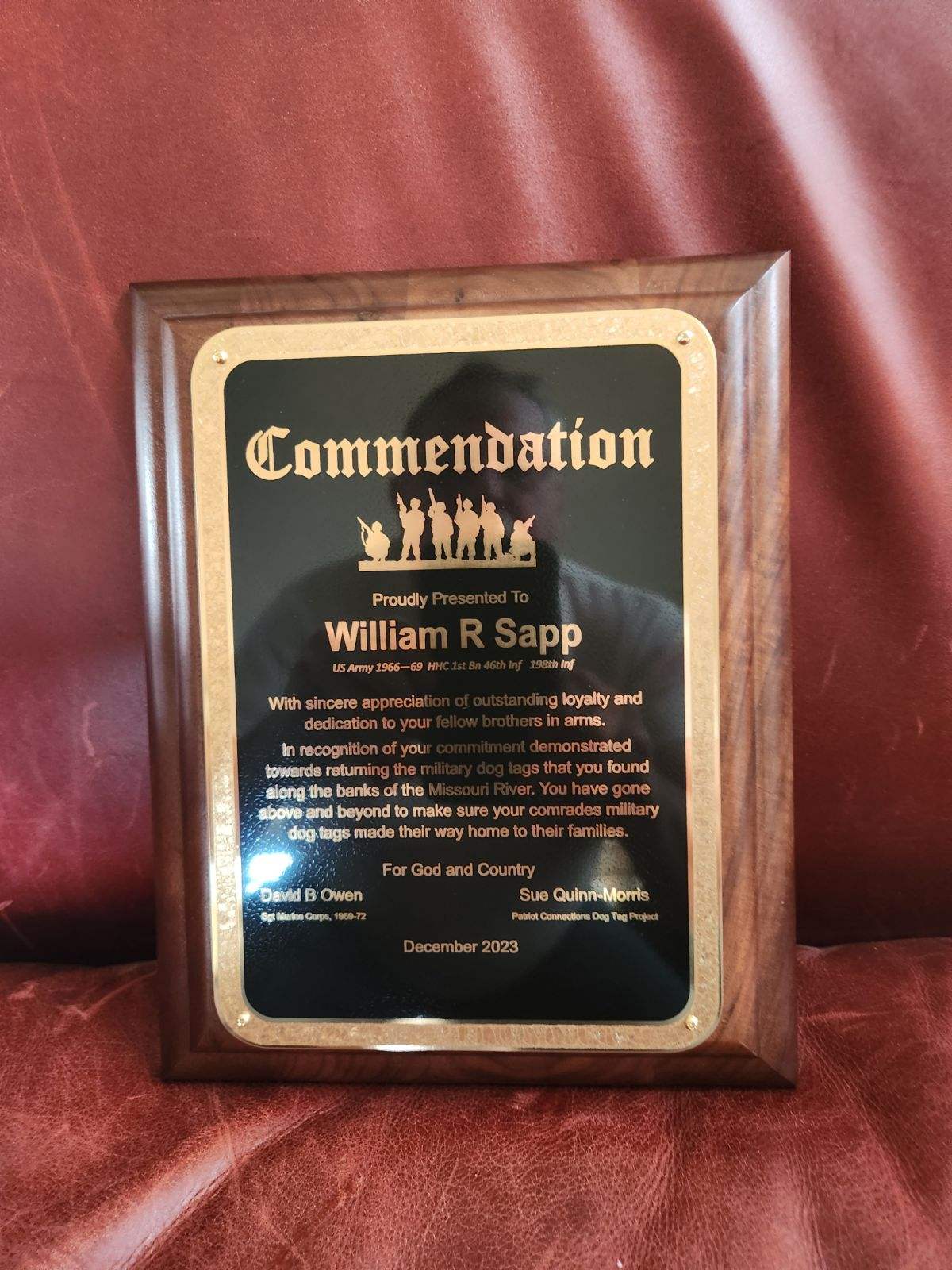 In December of 2023, in a heartwarming presentation, David Owen presented Bill Sapp a Commendation Plaque on behalf of himself and Sue Quinn-Morris of Patriot Connections Dog Tag Project. Bill Sapp's efforts in ensuring the safe return of his comrades' military dog tags truly highlights his commitment to honoring their memory.