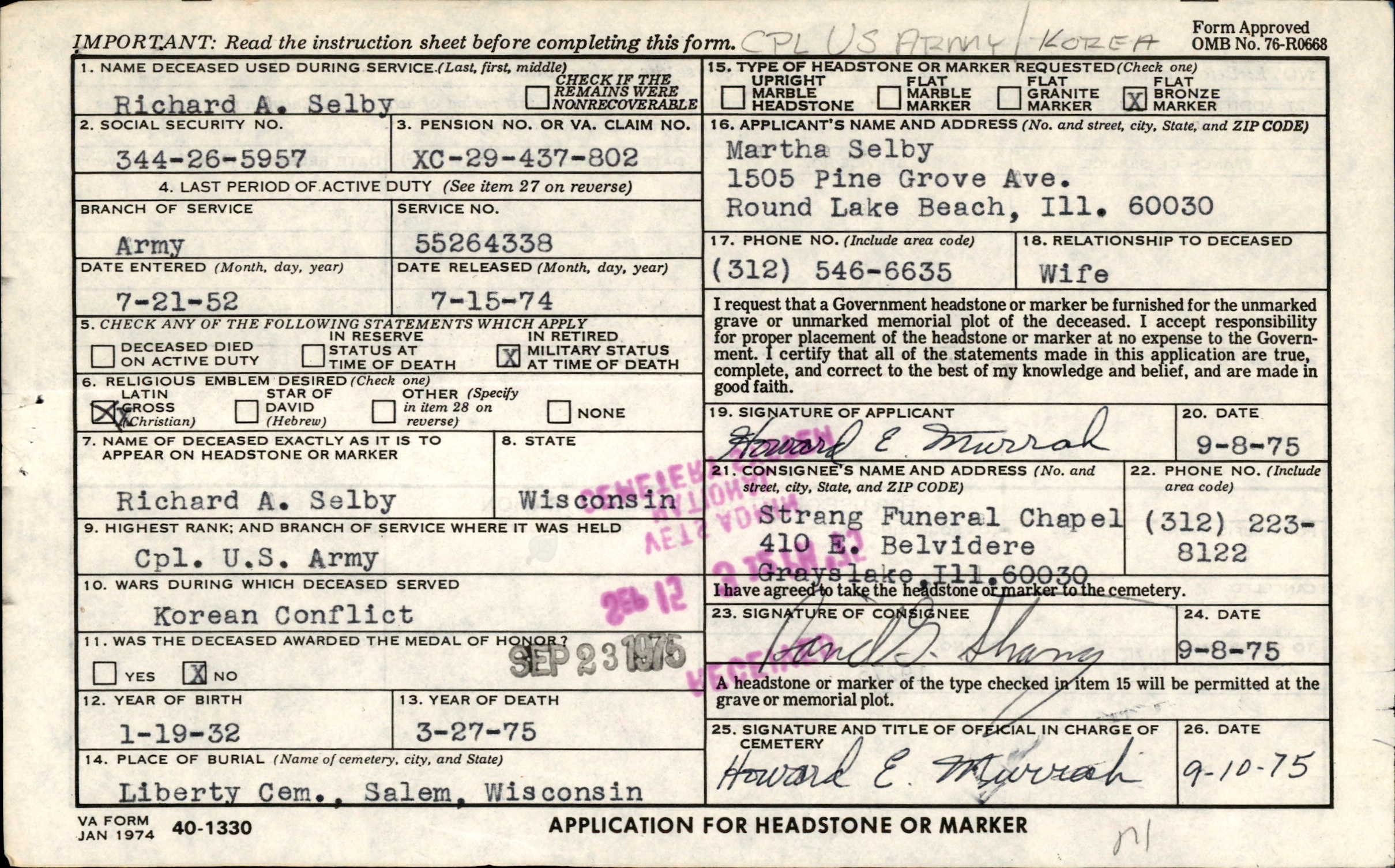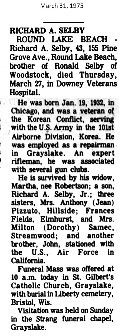 At the time of his death, he was survived by his widow, Martha, nee Robertson, a son Richard A Selby Jr, 3 sisters - Mrs ANthony (Jean) Pizzuto, Frances Fields, Mrs Milton (Dorothy) Samec and brothers Ron and JOhn. His funeral mass was at the St Gilbert's Catholic Church in Grayslake and burial was in Liberty Cemetery in Bristol, WI.