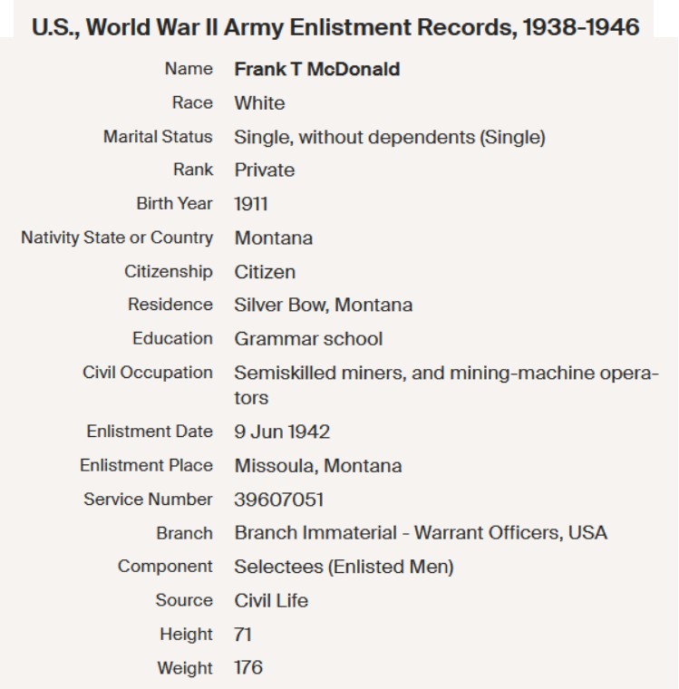 Frank T MCDONALD served in the US Army from June 1942 to January 1946.