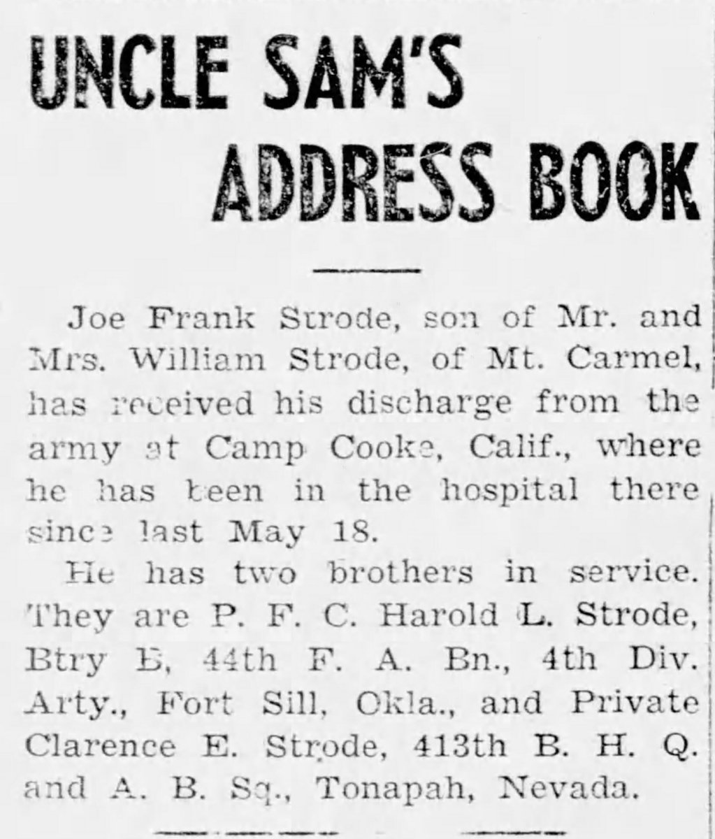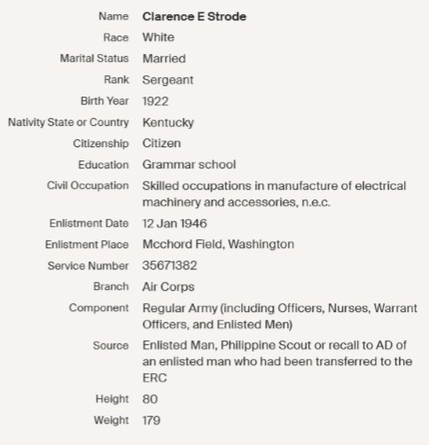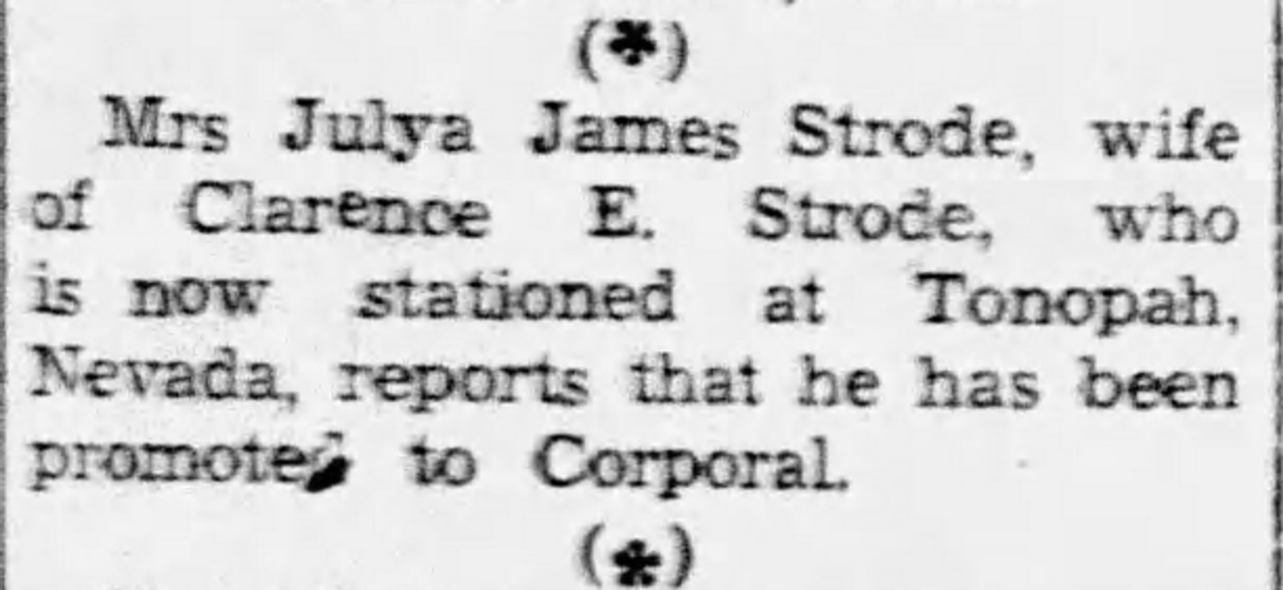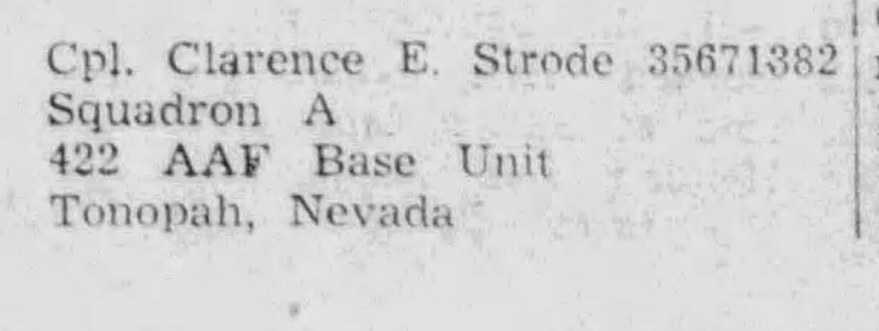 One of the dog tags belongs to Clarence E Strode, a WWII veteran. Clarence Strode entered the Army Air Force in November 1942 and served as a baker, being stationed at Camp Tonopah for a majority of his time in the service. Unfortunately, this WWII hero passed away at the age of 71, in Florida.