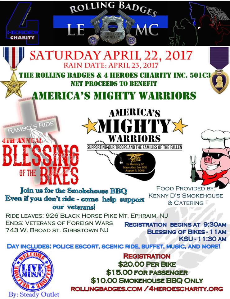 THKSThe Rolling Badges & 4 Heroes Charity Inc hosting 4th Annual Blessing of the Bikes to benefit Americas Mighty Warriors. Join us fo the Smokehouse BBQ. Registration beginas at 9:30am at Barbs HD, 926 Black Horse Pk, Mt Ephraim. Blessing of the Bikes 11am. KSU 11:30am. Day includes; Police Escot, scenic ride, buffet, music and more. $20 per bike, $15 passenger. $10 Smokehouse BBQ only. More info www.rollingbadges.com . Rain date April 23rd