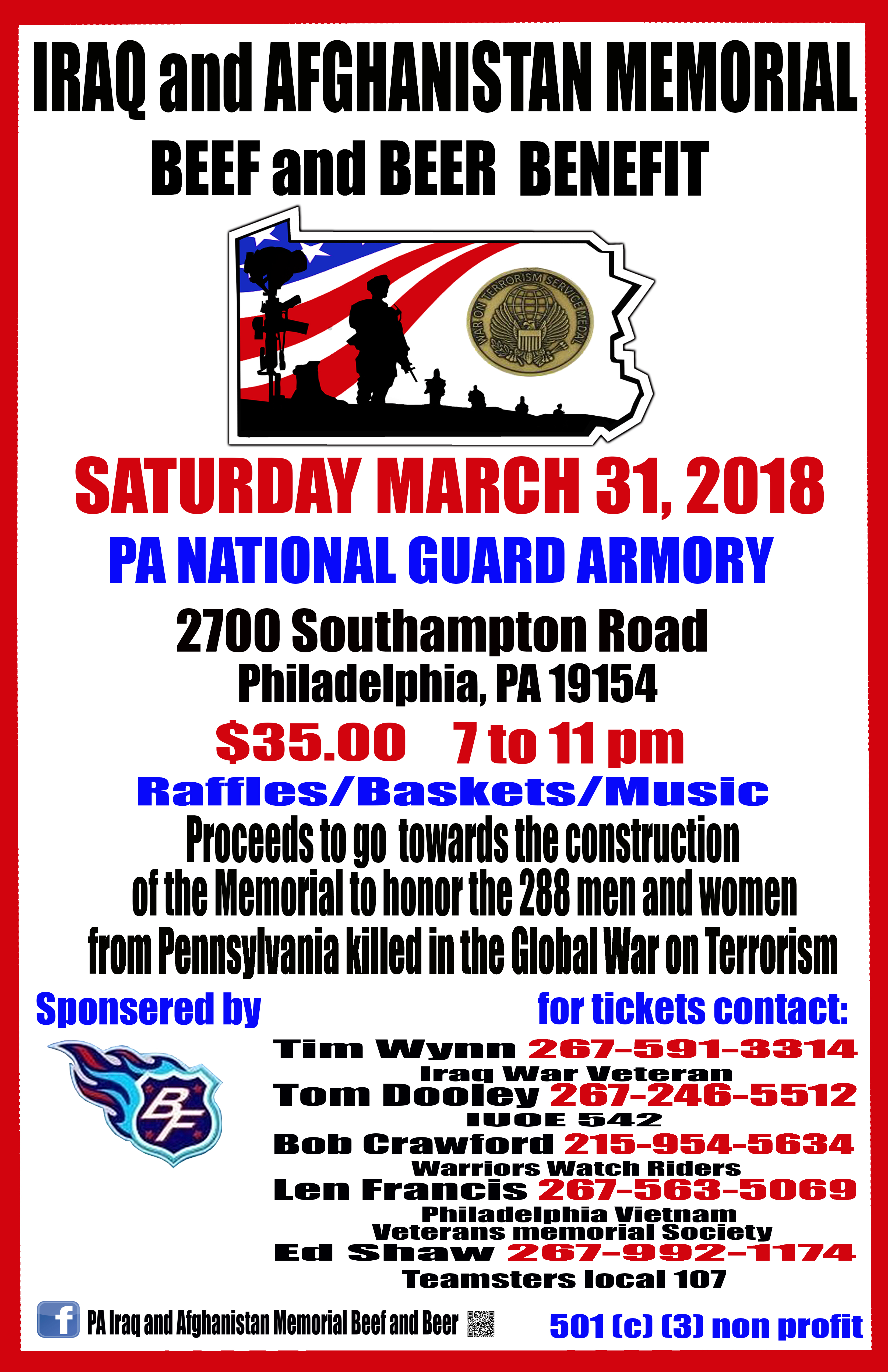 Our Beef and Beer Fundraiser, being held on March 31st from 7-11pm, will help in raising money to build a memorial in Philadelphia to honor the 288 Service members from Pennsylvania killed fighting the Global War on Terrorism in Iraq and Afghanistan. Beef and Beer Tickets $35 – Raffles, Baskets, Music. For tickets contact Tim at 267-591-3314 or Tom at 267-246-5512.