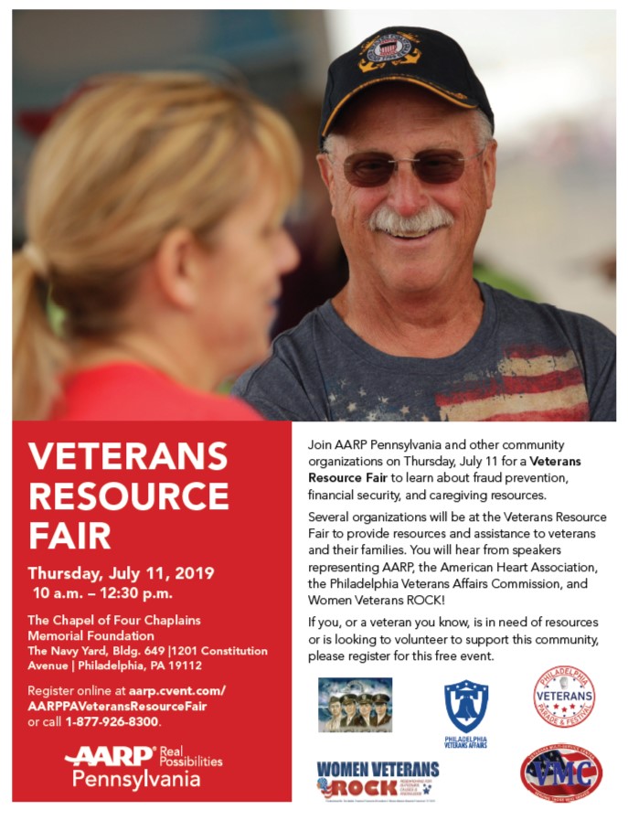 Join AARP Pennsylvania and other community organizations on Thursday, July 11th for a Veterans Resource Fair to learn about fraud prevention, financial security, and caregiving resources.
