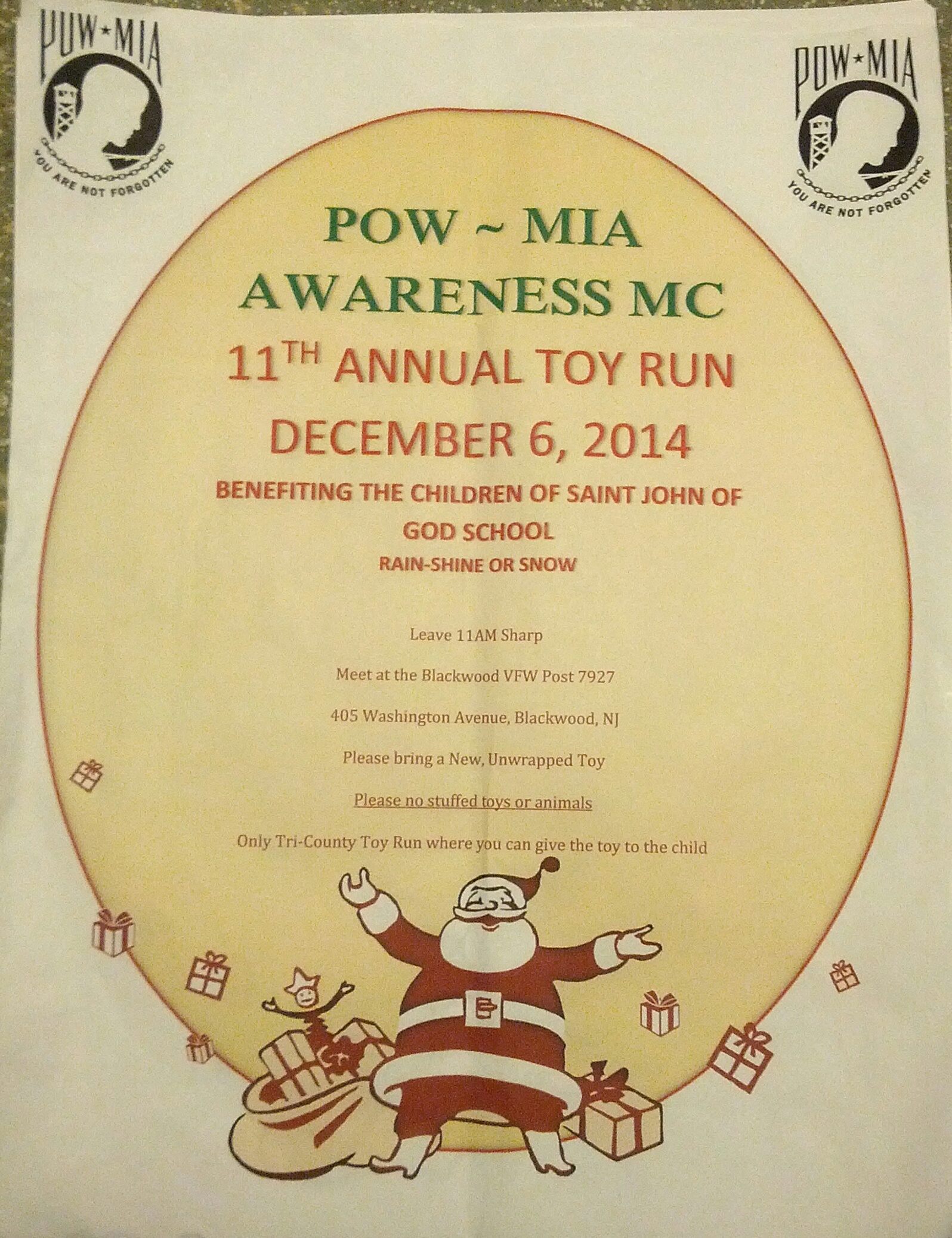 POW MIA Awareness MC 11th Annual Toy Run. Dec 6th. Benefitting the Children of Saint John of God School. Rain or Shine. Meet at the Blackwood VFW Post, 405 Washington Ave., Blackwood, NJ. We will leave at 11am sharp. Please bring a new, unwrapped toy. Please no stuffed toys or animals.
