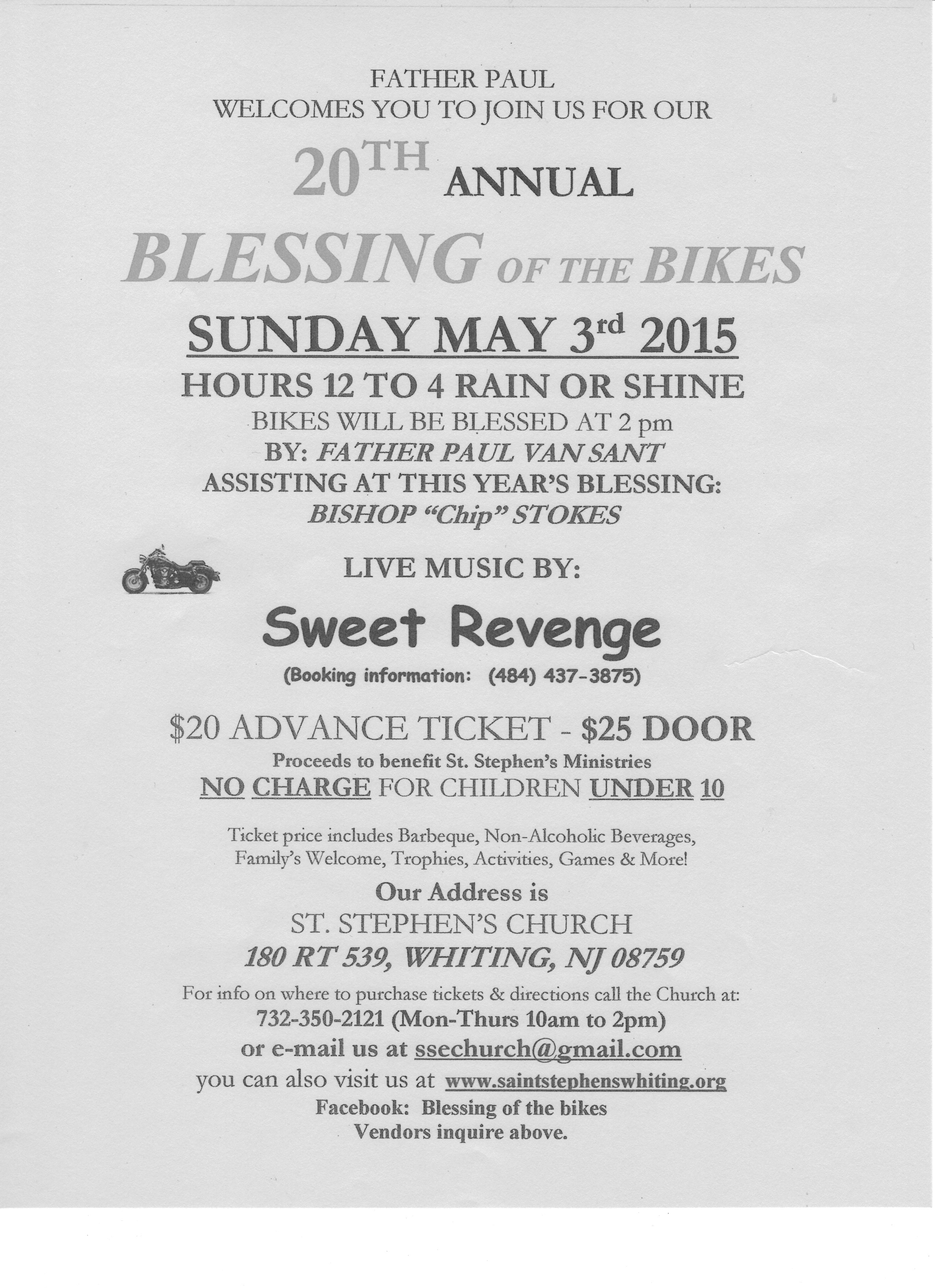 Father Paul Welcomes you to join in on the 20th Annual Blessing of the Bikes. Sunday, May 3rd. 12pm-4pm Rain or shine. Bikes will be blessed at 2pm. Assiting at this years event is Bishop “Chip” Stokes. Live music by Sweet Revenge. $20 advance tickets – $25 at door. no charge for children under 10. Includes BBQ, Non-alcoholic Veverages, Familys welcome, trophies, activities, games and more. To purchase tickets in advance call 732-350-2121 or email ssechurch@gmail.com.