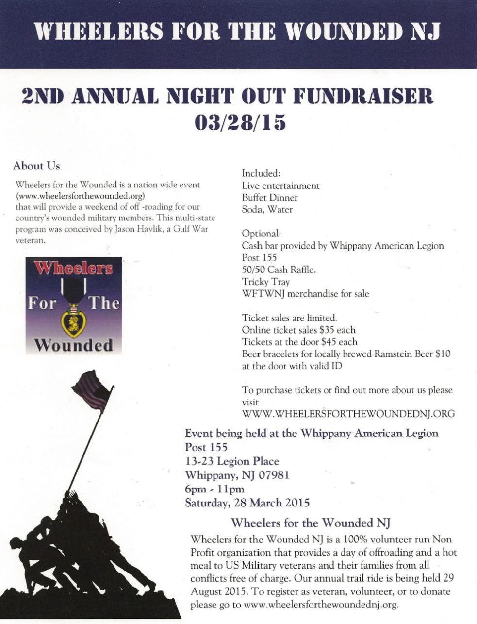 2nd Annual Night Out Fundraiser – March 28, 2015. Includes Live Entertainment, Buffet Dinner, Soda, Water. Optional: Cash bar, 50/50 Raffle, Tricky Tray WFTWNJ merchandise. Ticket sales are limited. Online tickets $35. Tickets at door $45. Beer bracelets for locally brewed Ramsten Beer $10 at door. To purchase tickets/more info go to http://www.wheelersforthewoundednj.org. Whippany American Legion, 13-23 Legion Place, Whippany, NJ 07981. 6pm – 11pm. Wheelers for the Wounded NJ provides a day of offroading and a hot meal to US Military veterans and their families from all conflicts free of charge.