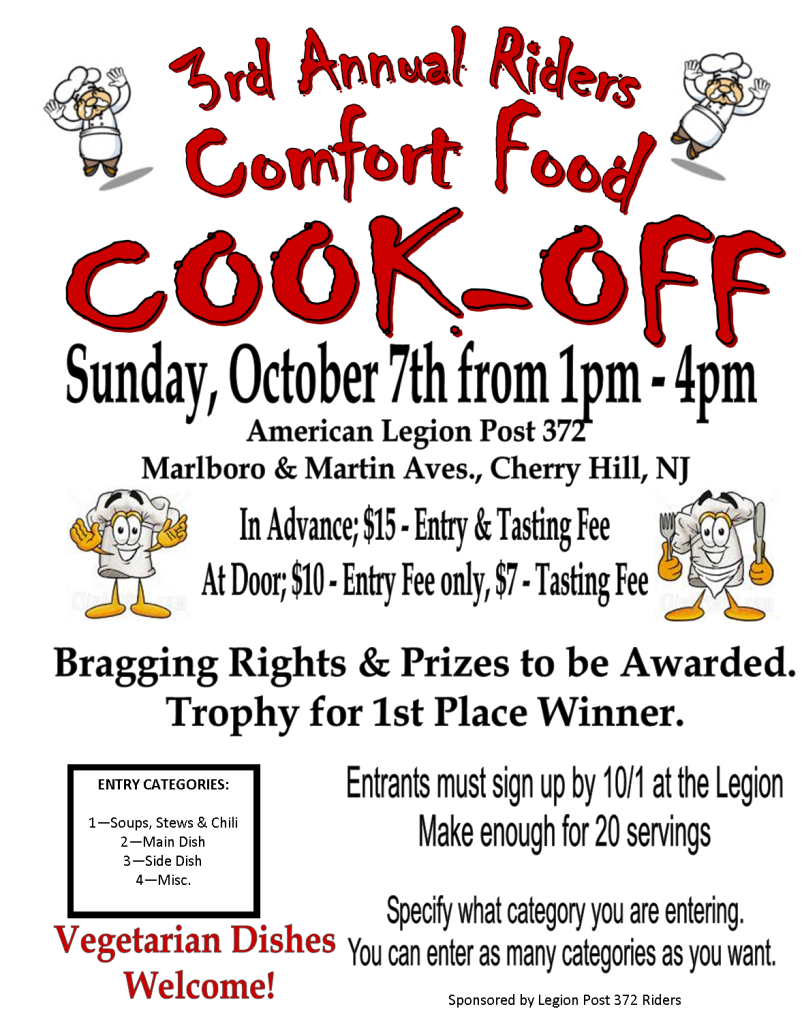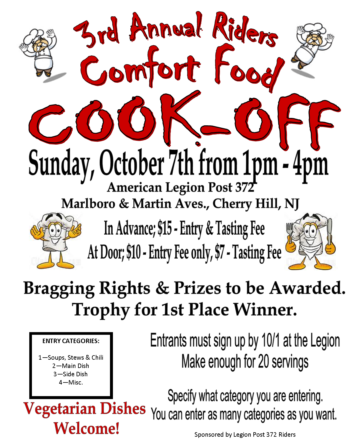 3rd Annual Legion Riders Comfort Food Cook Off to be held Sunday, October 7th, 1pm – 4pm.