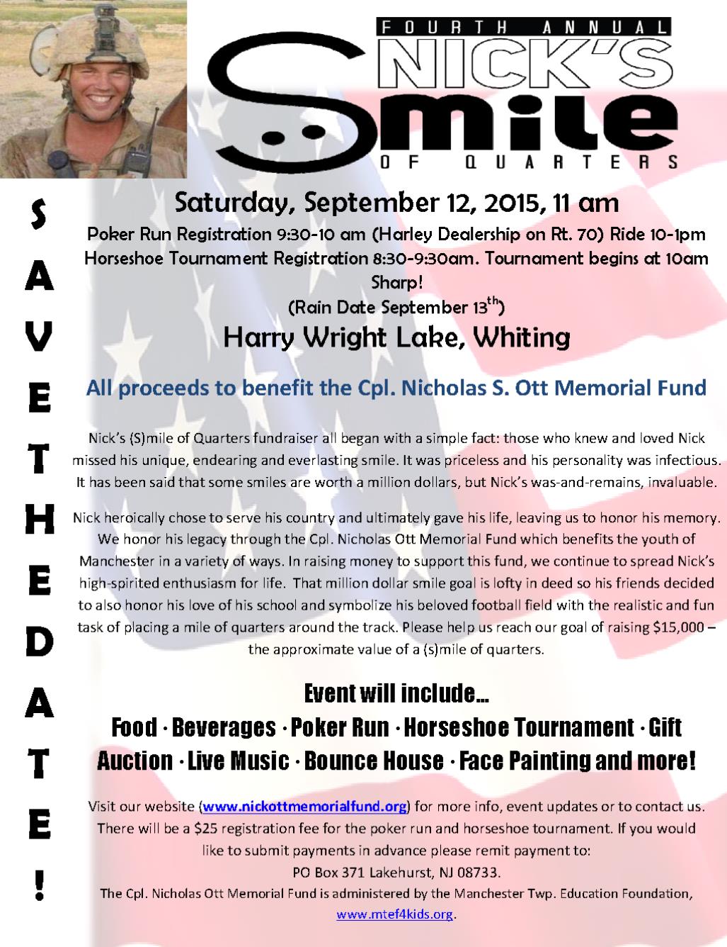 To benefit the Cpl Nicholas S. Ott Memorial Fund. Nick was killed in Afghanistan in 2011. Since then, we have created a Memorial Fund to keep his legacy alive. Poker Run registration 9:30-10am at Harley Dealership, Rt 70, Lakewood, NJ. Ride 10-1pm. Horseshoe tournament registration 8:30-9:30am. Tournament begins at 10am sharp. Tournament and party at Harry Wright Lake, Whiting, NJ. Rain Date Sept 13th. . Event includes food, beverages, poker run, horseshoe tournament, gift auction, live music, bounce horse, face painting and more. All proceeds benefit the Cpl Nicholas S Ott Memorial Fund. More info, tickets, and to pre register etc go to www.nickottmemorialfund.org