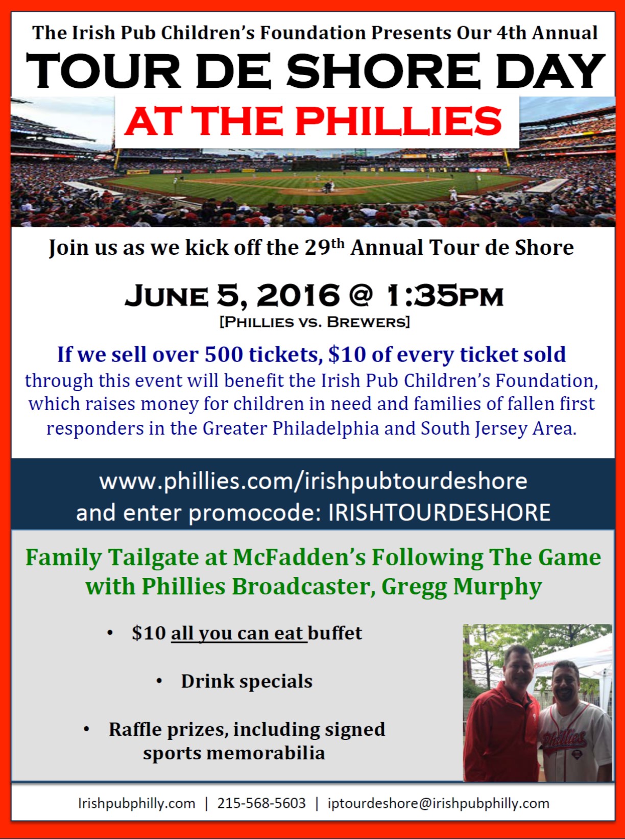 If we sell over 500 tickets, $10 of every ticket sold through this event will benefit the Irish Pul Childrens Foundation, which raises money for the children in need and families of fallen first responders in the greater Philadelphia and South Jersey area. Family tailgate at McFaddens following the game with Phillies broadcaster Gregg Murphy. $10 all you can eat buffet, drink specials, raffle prizes.