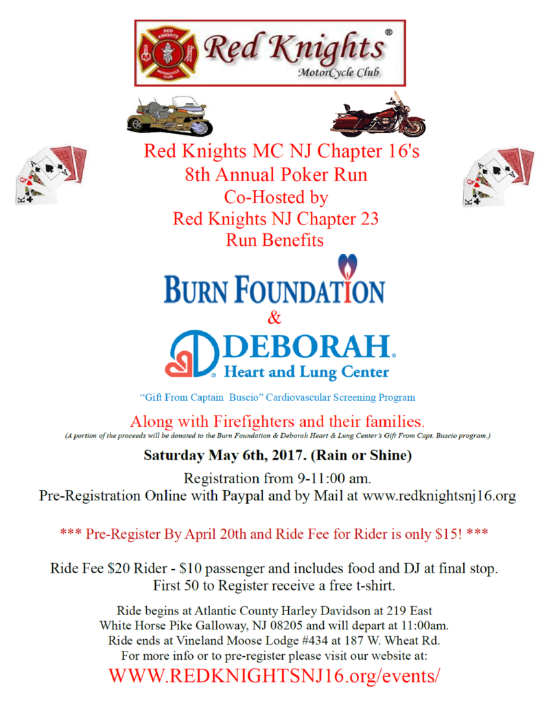 The ride begins at Atlantic County Harley-Davidson, 219 East White Horse Pike in Galloway. Registration is from 9:00 am to 11:00 am. Motorcycles go out at 11:00 am rain or shine. Pre-registration is also available online. Pre-register by April 20th and the fee for the rides is $15.00. On the day of the ride the fee is $20.00 for the rider and $10,99 for the passenger. The ride fee includes food at the end of the ride. The first 50 riders to register wil receive a t-shirt. The ride ends with food and a DJ. Proceeds go to The Burn Foundation and The Deborah Hospital’s “Gift From Captain Buscio” Cardiovascular Screening Program along with Firefighters and their families. For more information call (856) 982-8872, or go to http://redknightsnj16.org.
