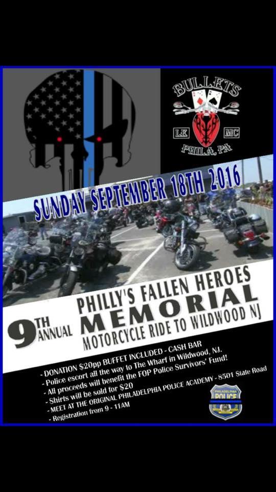 9th Annual Fallen Heroes Memorial ride to Wildwood, NJ. Donation $20 pp. Buffet Included – Cash Bar. Police escort all the way to The Wharf in Wildwood. Shirts will be sold for $20. Meet at the Original Philadelphia Police Academy, 8501 State Rd., Philadelphia. REgistration from 9-11am. Sept 18th