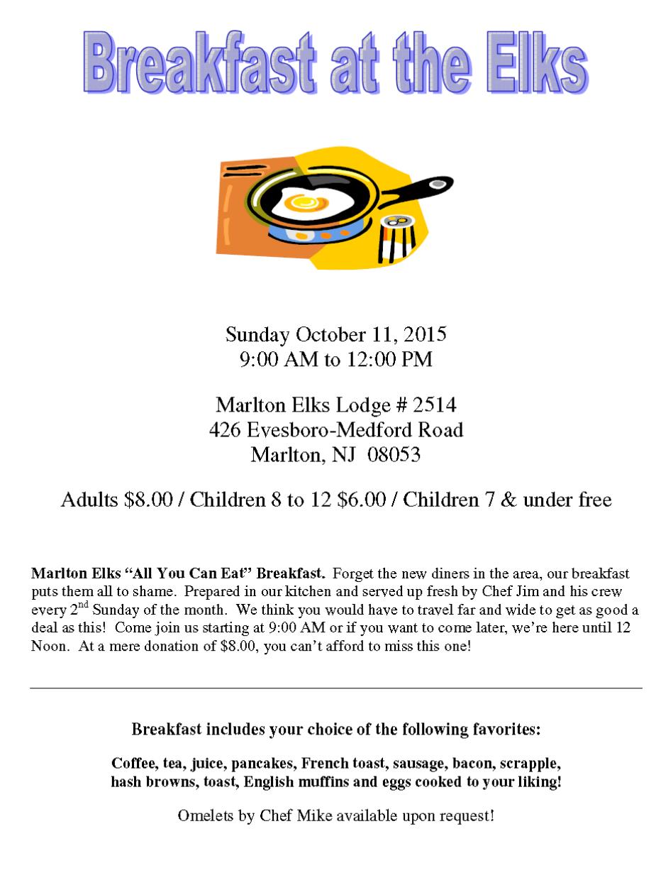 Breakfast at the Elks. Adults $8, Children 8-12 $6, Children 7 and under free. Marlton Elks All you can Eat Breakfast. Forget the new diners in the area, our breakfast puts them all to shame. Prepared in our kitchen and served up fresh by Chef Jim and his crew every 2nd Sunday of the month. We think you would have to travel far and wide to get as good a deal as this! Come join us starting at 9am or if you want to come later, we are here until 12noon. At a mere donation of $8, you cant afford to miss this one!. Breakfast includes your choice of the following favorites; Coffee, tea, juice, pancakes, french toast, sausage, bacon, scrapple, hash browns, english muffins and eggs cooked to your liking! Omelets by Chef Mike available upon request!