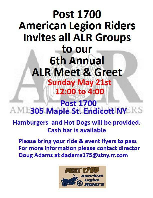 American Legion Riders Meet & Greet at Post 1700, 305 Maple St., Endicott, NY. Hamburgers and hot dogs provided. Cash bar available. Please bring your ride and event flyers to pass along. More info contact Doug Adams at dadams175@stny.rr.com