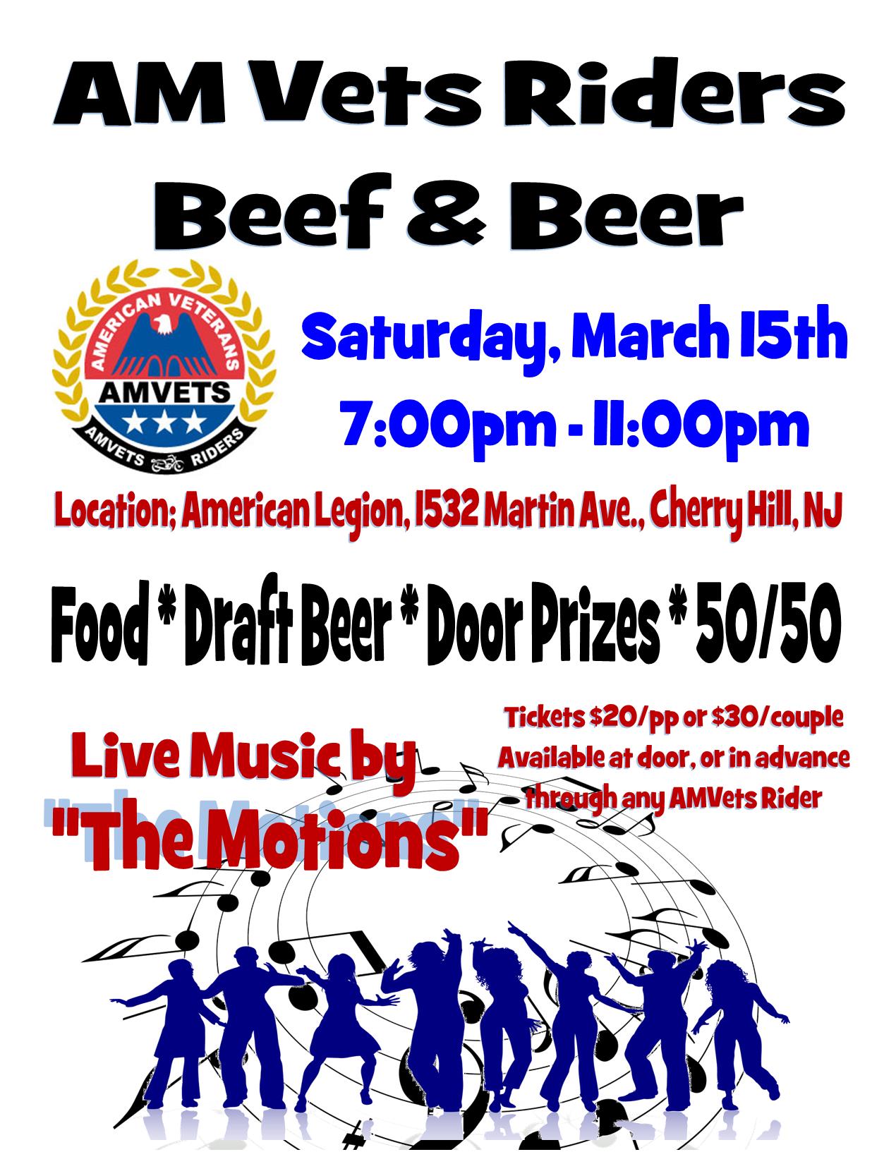 Food, Draft Beer, 50/50, Door Prizes. Live music by “The Motions” Tickets $20/pp or $30/per couple. 7pm-11pm. Tickets can be purchased from any AM Vet Rider or at the door. Beef and Beer will be held at the American Legion, 1532 Martin Ave., Cherry Hill, NJ