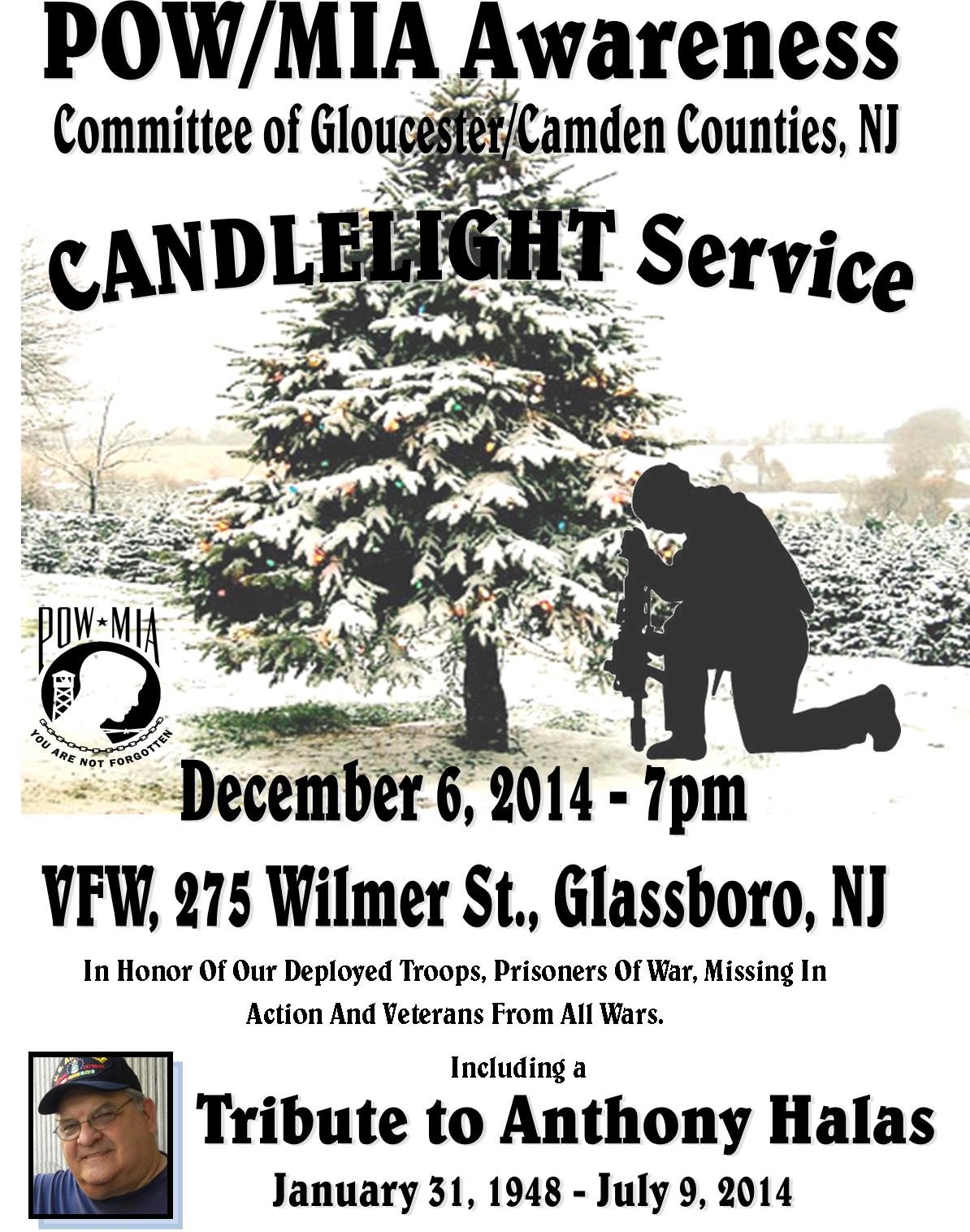 Annual Holiday POW/MIA Candlelight Service. 7pm. Join us in honoring of our deployed troops, prisoners of war, missing in action and veterans from all wars. Including a Memorial for Tony Halas – past Vice President of the POW/MIA Awareness Committee and Tree Lighting Ceremony with Santa and the family of Tony Halas. Master of Ceremonies – SFC Allen Rodesky