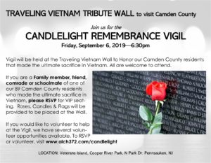 – 6:30pm – Candlelight Remembrance Vigil – Location: Veterans Island, in front of the Traveling Wall – Honoring our Camden County Vietnam KIA. Families, friends, comrades and community to be in attendance for this somber and meaningful tribute to our fallen. .