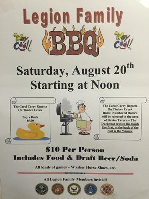 Legion Family BBQ Saturday August 20th. 12noon. $10 per person. Includes food, draft beer and soda. American Legion Post 281