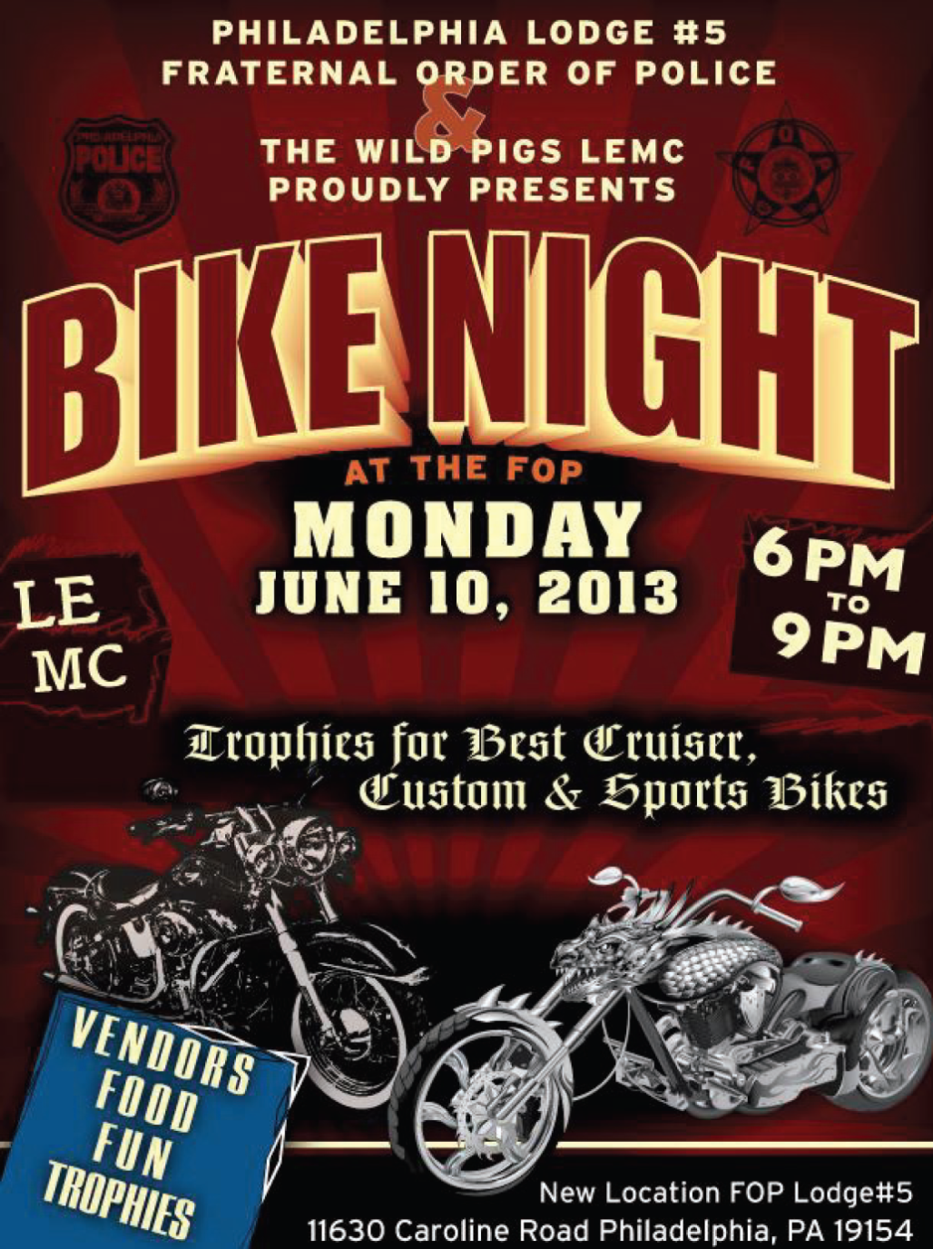 FOP Lodge #5 Bike Night brought to you by The Wild Pigs LE MC, Monday, July 8, 2013 from 6p-9p at 11630 Caroline Rd in Northeast Philadelphia. Trophies will be awarded to the best bikes. Vendors, Food, Fun. http://www.fop5.org/