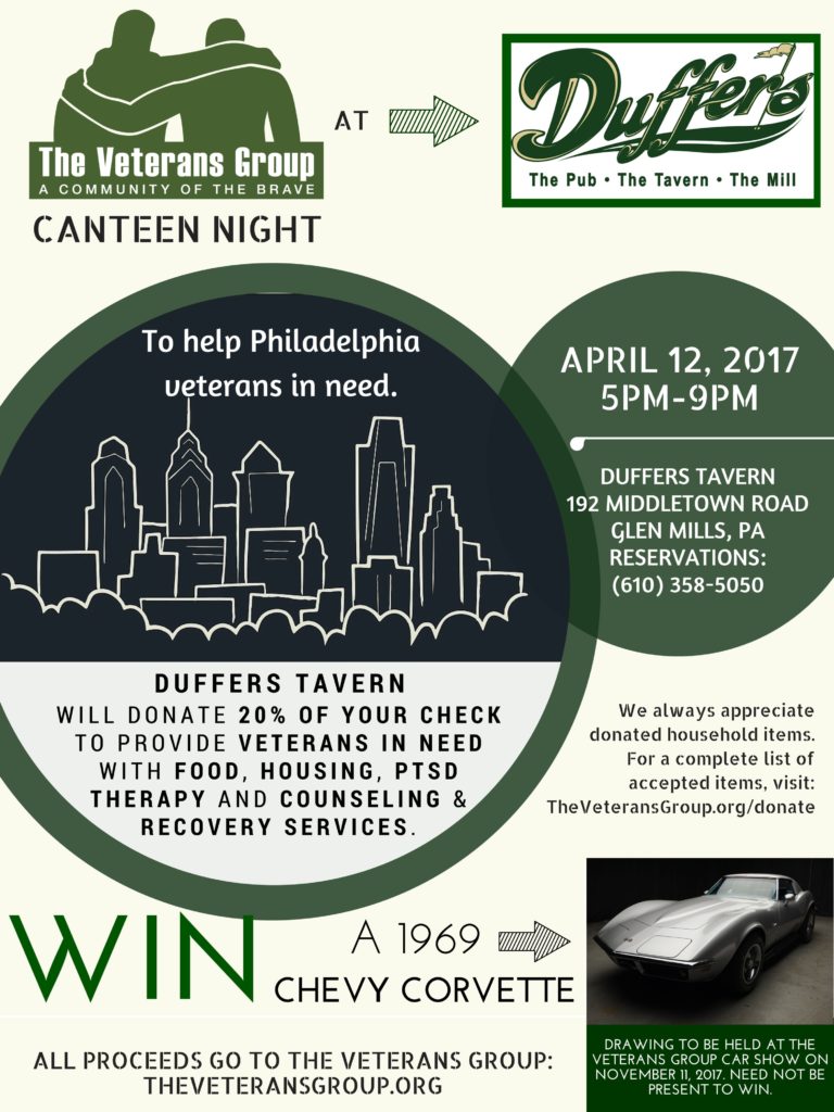 Join The Veterans Group at Duffers Tavern on Wednesday April 12th for our first Canteen Night of 2017! Between 5pm and 9pm, Duffers Tavern will donate 20% of your check to support our Veterans in need.