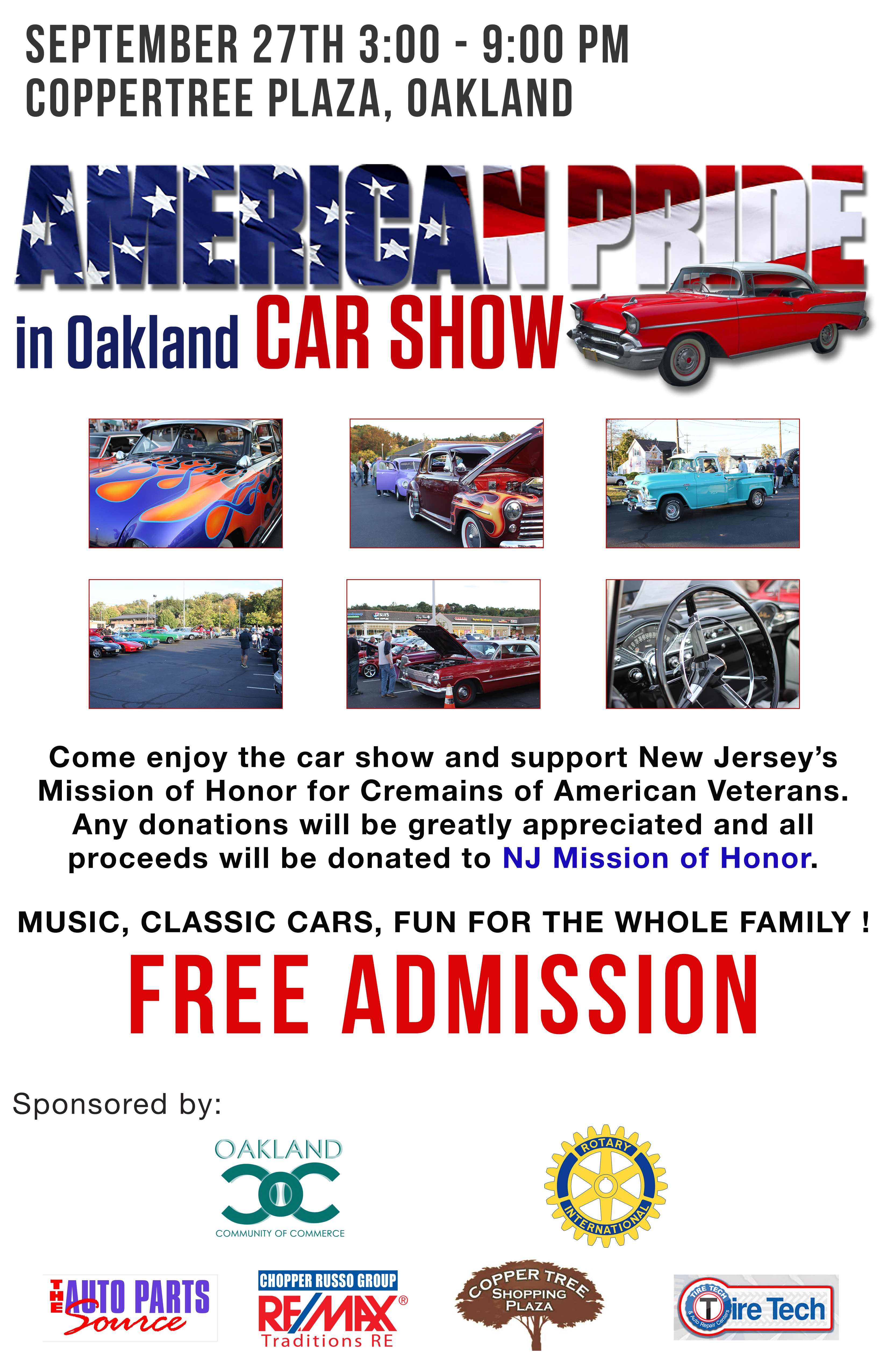 The Oakland, Franklin Lakes Rotary Club is sponsoring a car show on the 27th of September at the Copper Tree Mall, in Oakland at 3:00 pm to 9:00 pm. All precedes will benefit the New Jersey’s Mission of Honor for Cremains of American Veterans. Free admission and all are welcome to put their car in the show. For more information please open the attachments above or contact Francis Carrasco 201 906 1592.