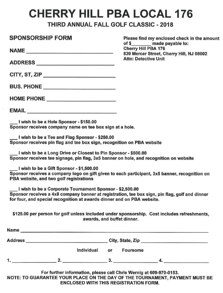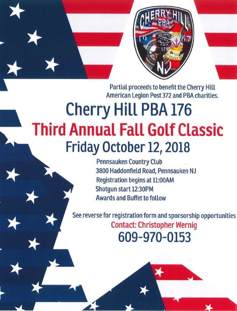 Come on out for a great day of golf at the Pennsauken Country Club on Friday, October 12th, 2018. Registration 11am. Shotgun starts at 12:30. Awards and buffet to follow. $125 pp. Cost includes golf, drinks and buffet dinner. Sponsorship opportunities available. Click here to download/print Registration form and sponsorship opps. Questions?…call Chris W at 609-970-0153. Proceeds benefit American Legion Post 372 and other PBA Charities.