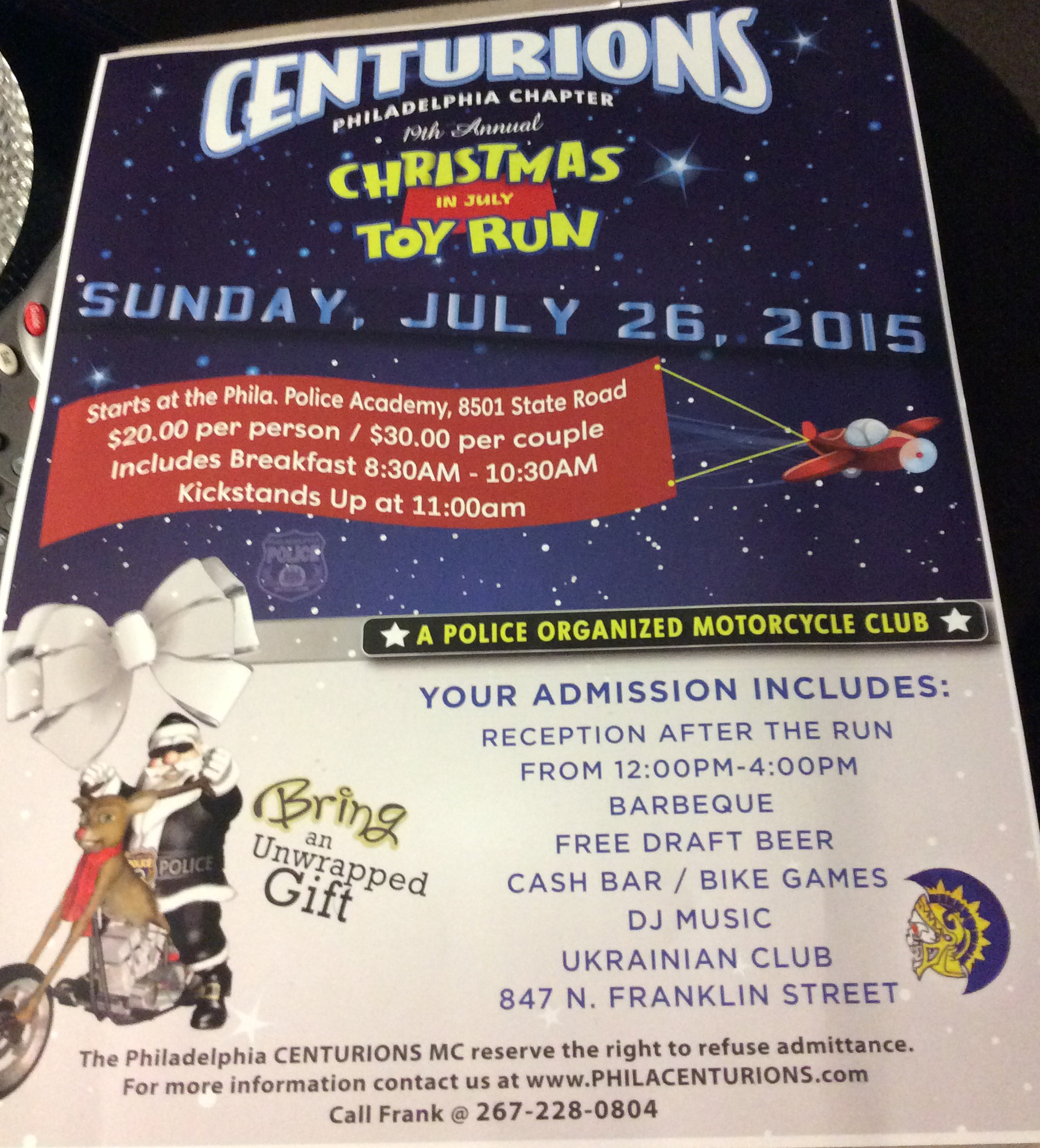 Christmas in July Toy Run. Starts at the Phila. Police Academy, 8501 State Rd., Phila. $20 pp/ $30 per couple. Inclusdes breakfast 8:30am – 10:30am. KSU at 11am. Goes to Shriiners Hospital for Children. Your admission includes; Reception after the Run from 12nooon – 4pm. BBQ, Draft Beer, Cash bar/bike games, DJ Music at the Ukrainian Club, 847 N. Franklin St, Phila. More info call Frank at 267-228-0804.