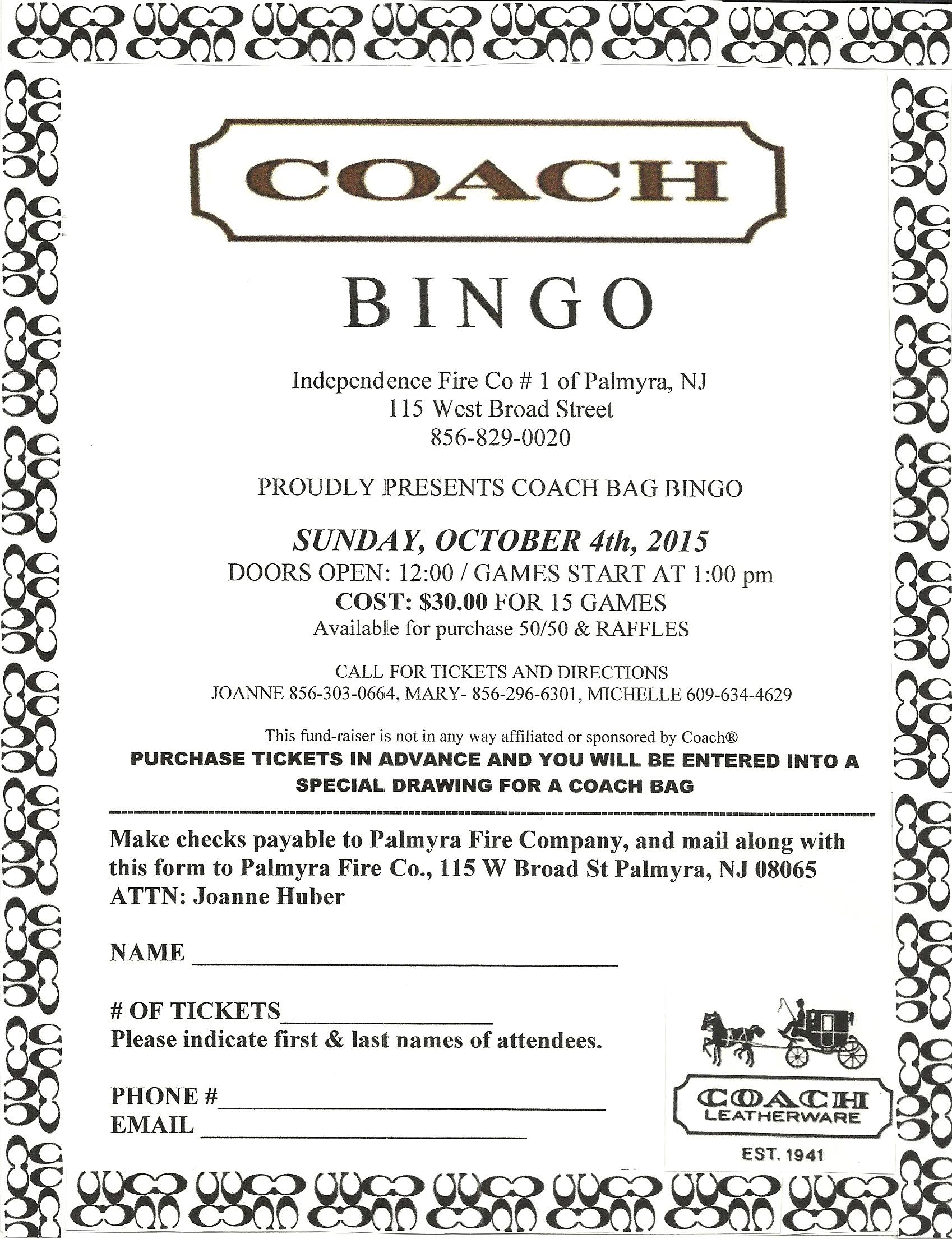 Come out and join us for an afternoon of fun! Palmyra Fire Company’s Coach Bag bingo fundraiser. 15 games for $30. Raffle and 50/50 available for purchase. Purchase your tickets in advance and be entered into a special drawing for a Coach bag. For information or tickets contact Mary 856-296-6301 or Michelle 609-634-4629 or Joanne 609-685-1321.